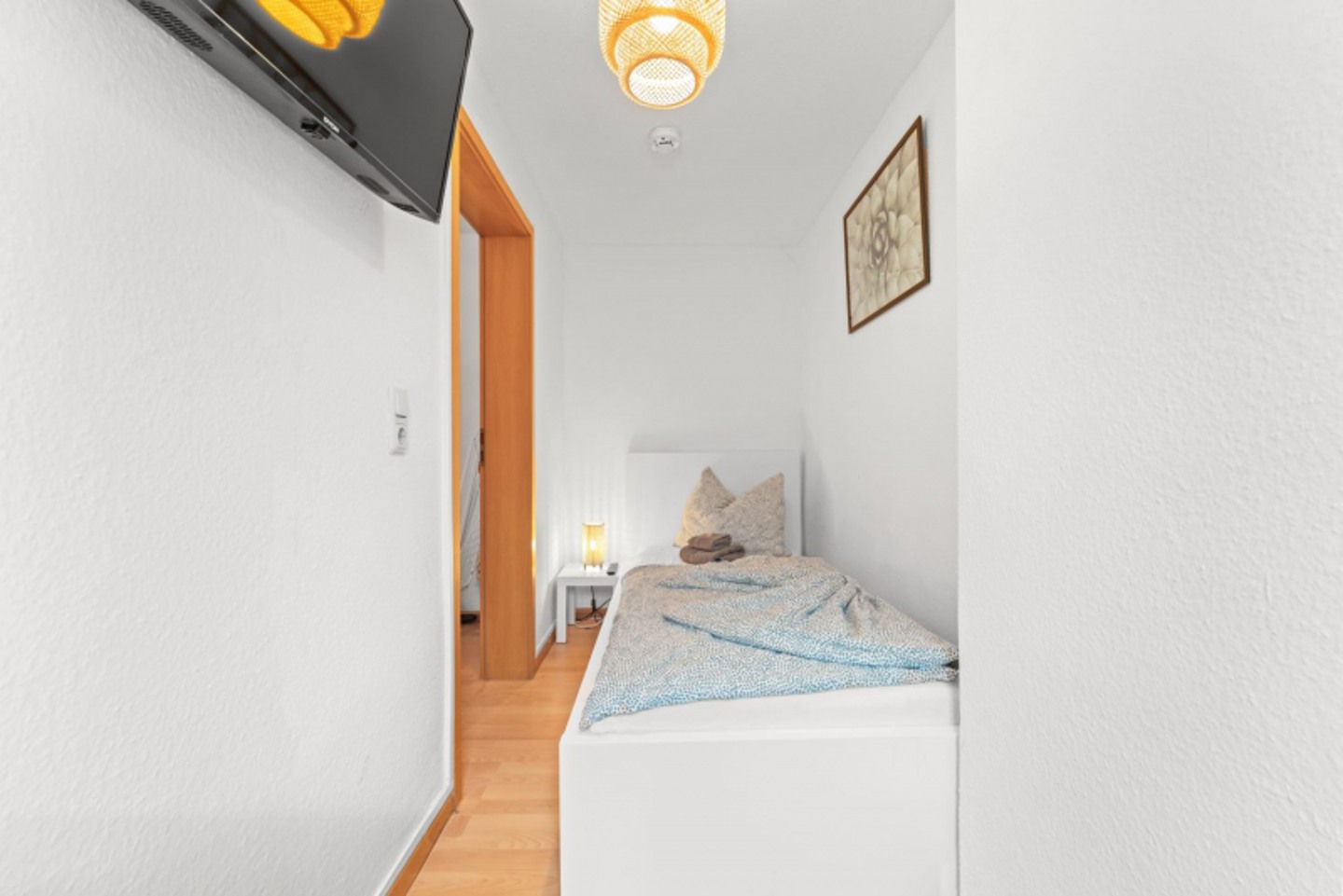 Schlafzimmer 1: 1 Einzelbett, Kleiderschrank, Bettwäsche
