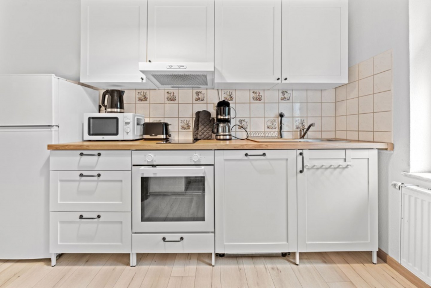 Küche und Haushaltsgegenstände: Küche (Raum), Essecke, Kaffeemaschine, Geschirr, Tiefkühler, Wasserkocher, Mikrowelle, Backofen, Kühlschrank, Herd 4-Zonen, Toaster