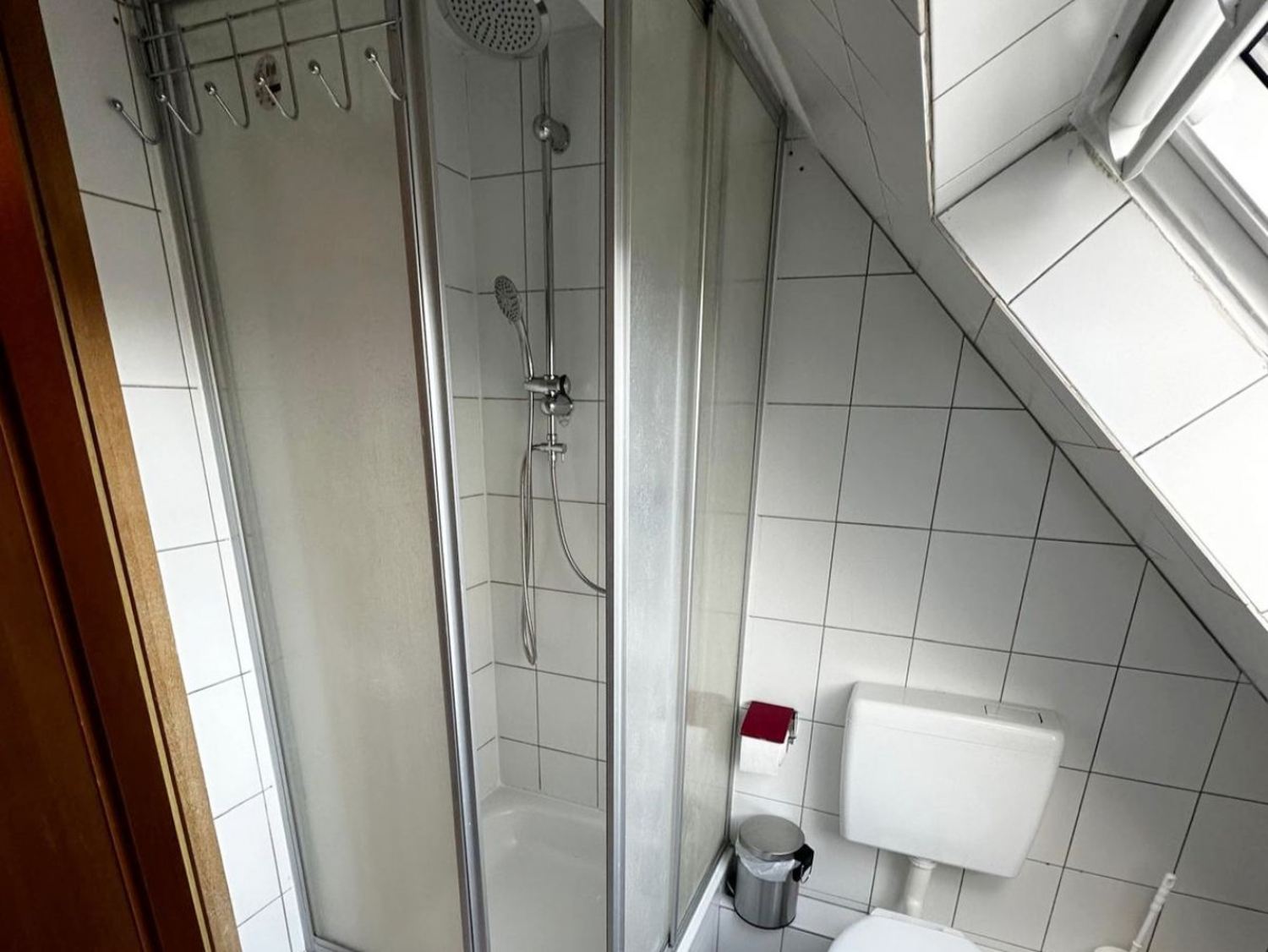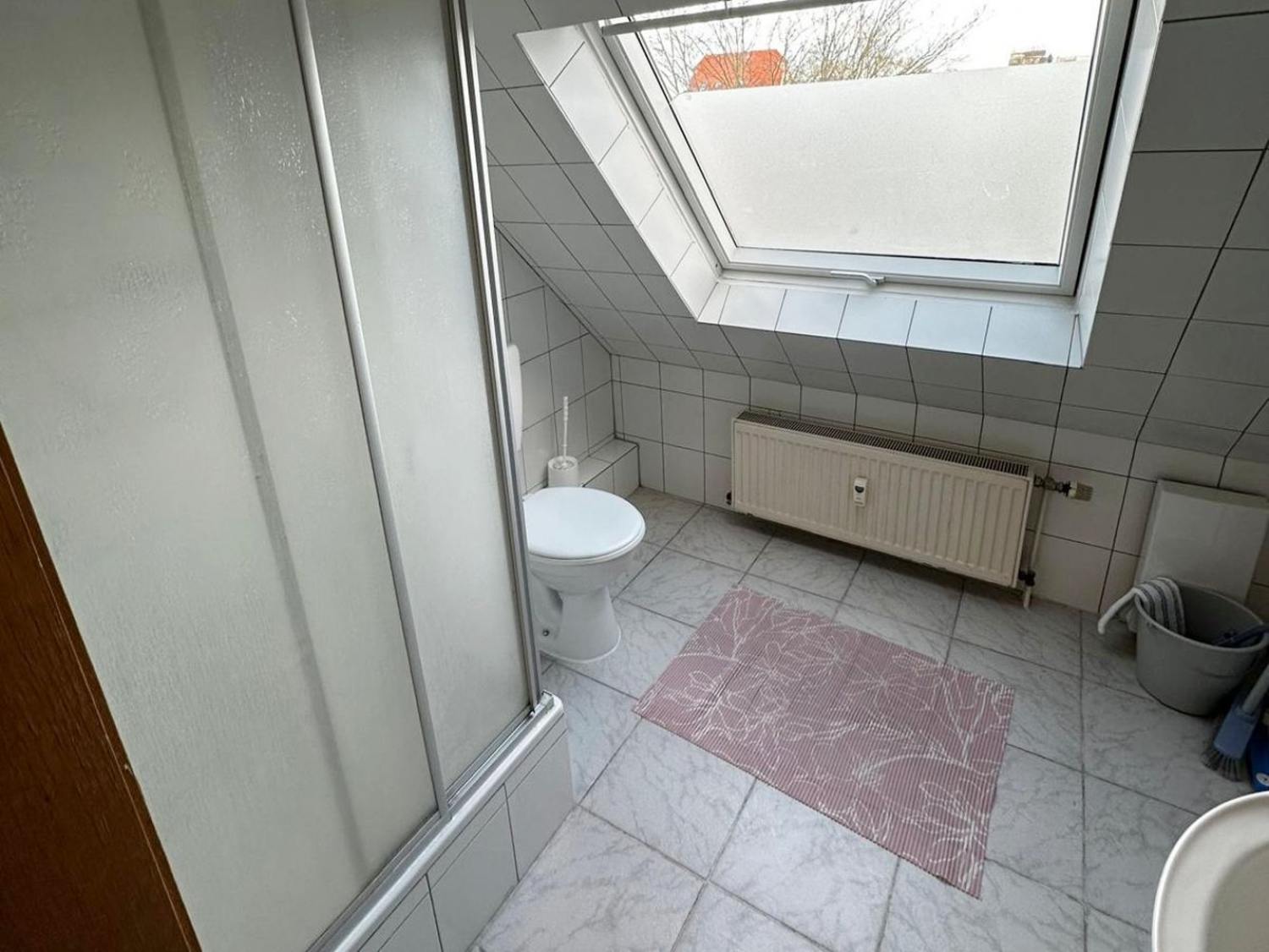 Badezimmer: Duschwanne, Waschbecken, WC