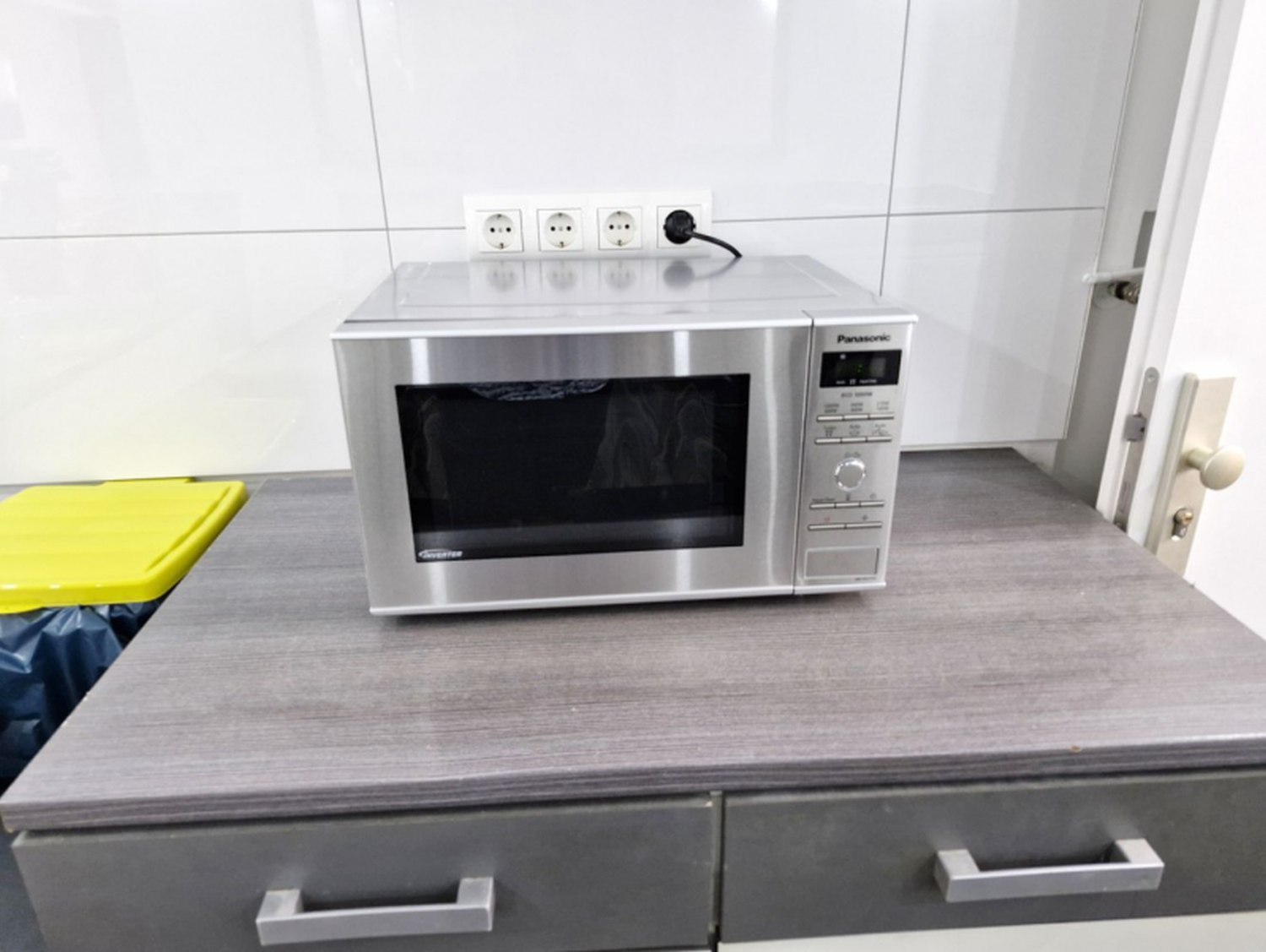 - Essbereich mit Kühlschrank, Kaffeemaschine, Toaster und Wasserkocher