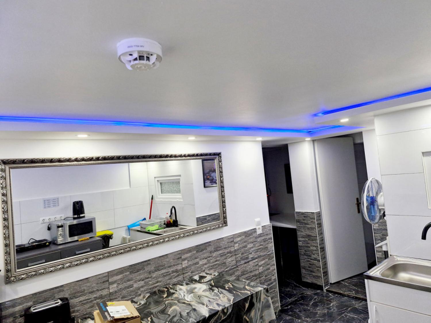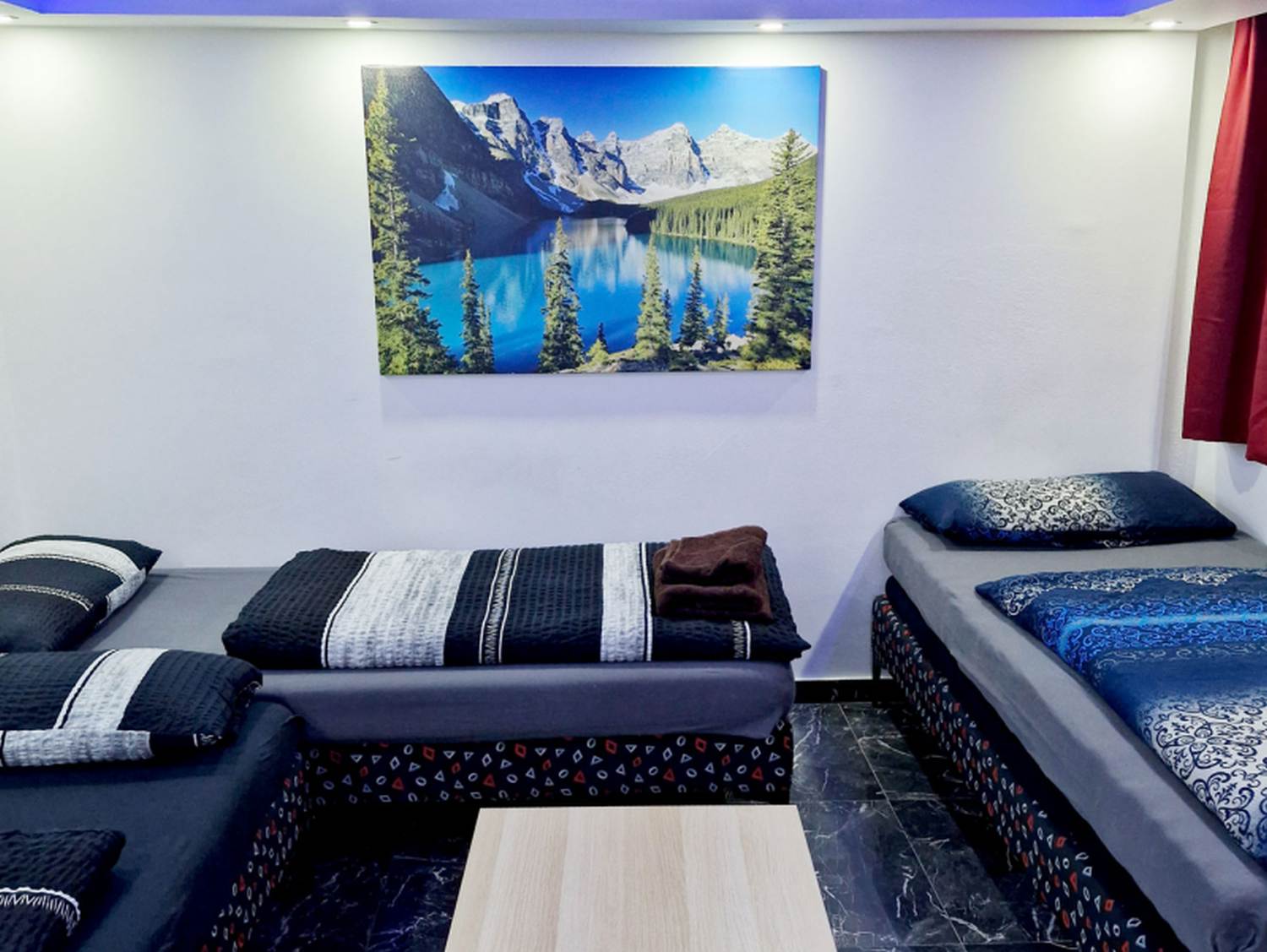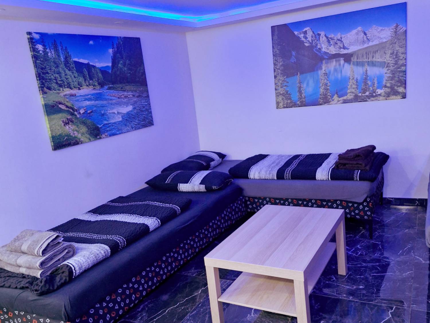 Sind Sie auf der Suche nach einer komfortablen Monteurwohnung für Ihr Team? Unsere geräumige Untergeschoss-Wohnung bietet Platz für 3-4 Personen und ist ideal für Monteure. Mit einer Fläche von 40 m² bietet sie ein großes Wohn- und Schlafzimmer mit 4 Einzelbetten und komplett bezogener Bettwäsche. Eine separate Küche wird innerhalb von 8-10 Wochen installiert sein, aber grundlegende Küchenausstattungen sind bereits vorhanden. Der Essbereich befindet sich im Flur und umfasst einen Kühlschrank sowie einen Esstisch.