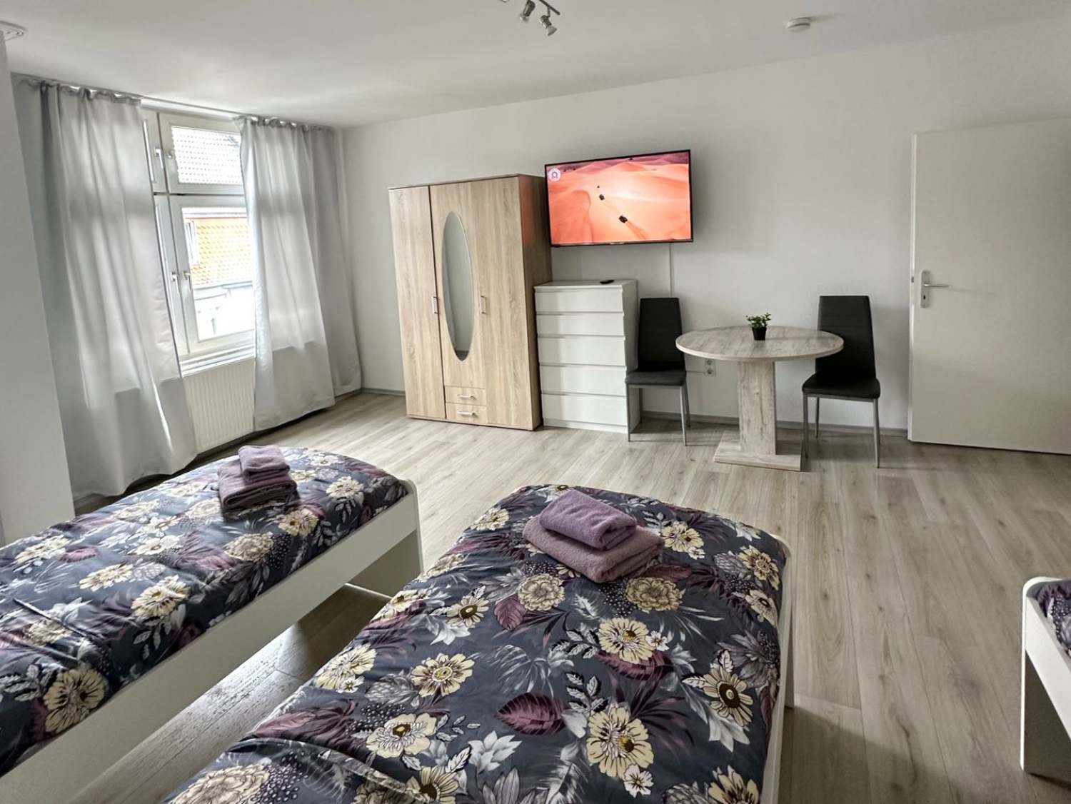Schlafzimmer 1: 3 Einzelbetten, Bettwäsche, Kleiderschrank, Smart-TV
