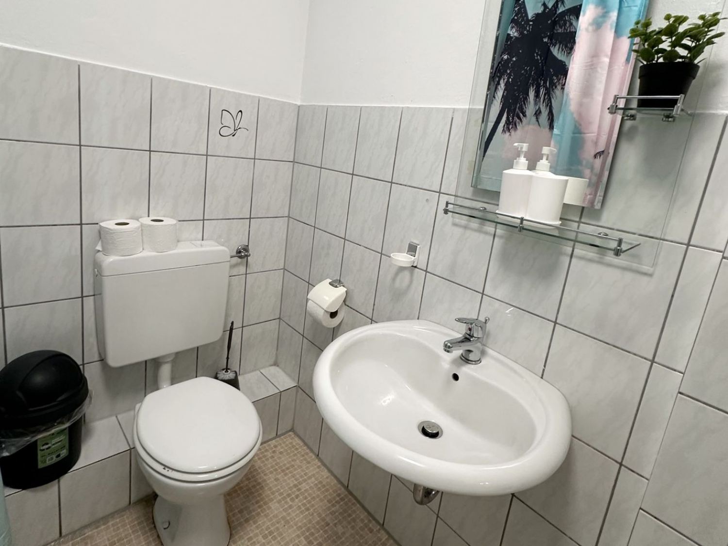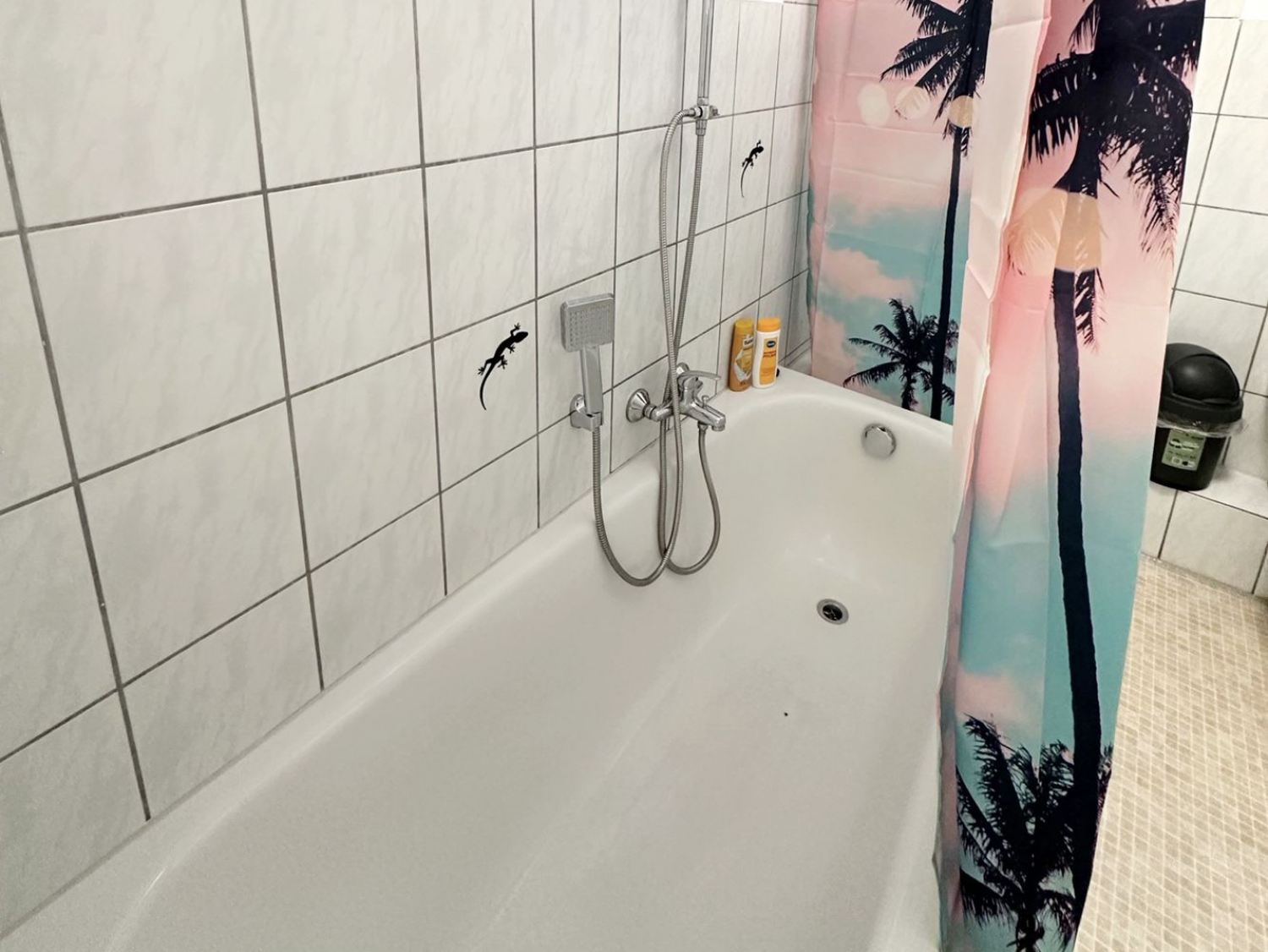 Badezimmer: Dusche, Badewanne (Duschwanne), Shampoo, WC, Handtücher, Waschbecken