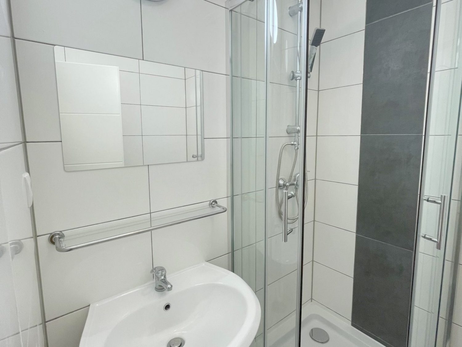 Badezimmer: Duschwanne, Badewanne, Waschbecken, WC