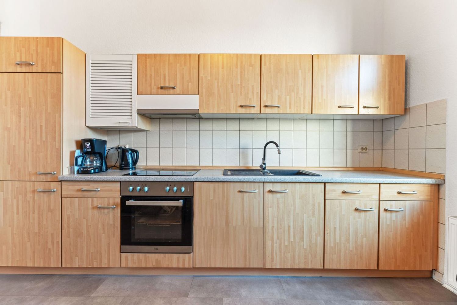 Küche und Haushaltsgegenstände: Küche (Raum), Essecke, Kaffeemaschine, Geschirr, Spülmaschine, Tiefkühler, Wasserkocher, Mikrowelle, Backofen, Kühlschrank, Herd 4-Zonen, Toaster