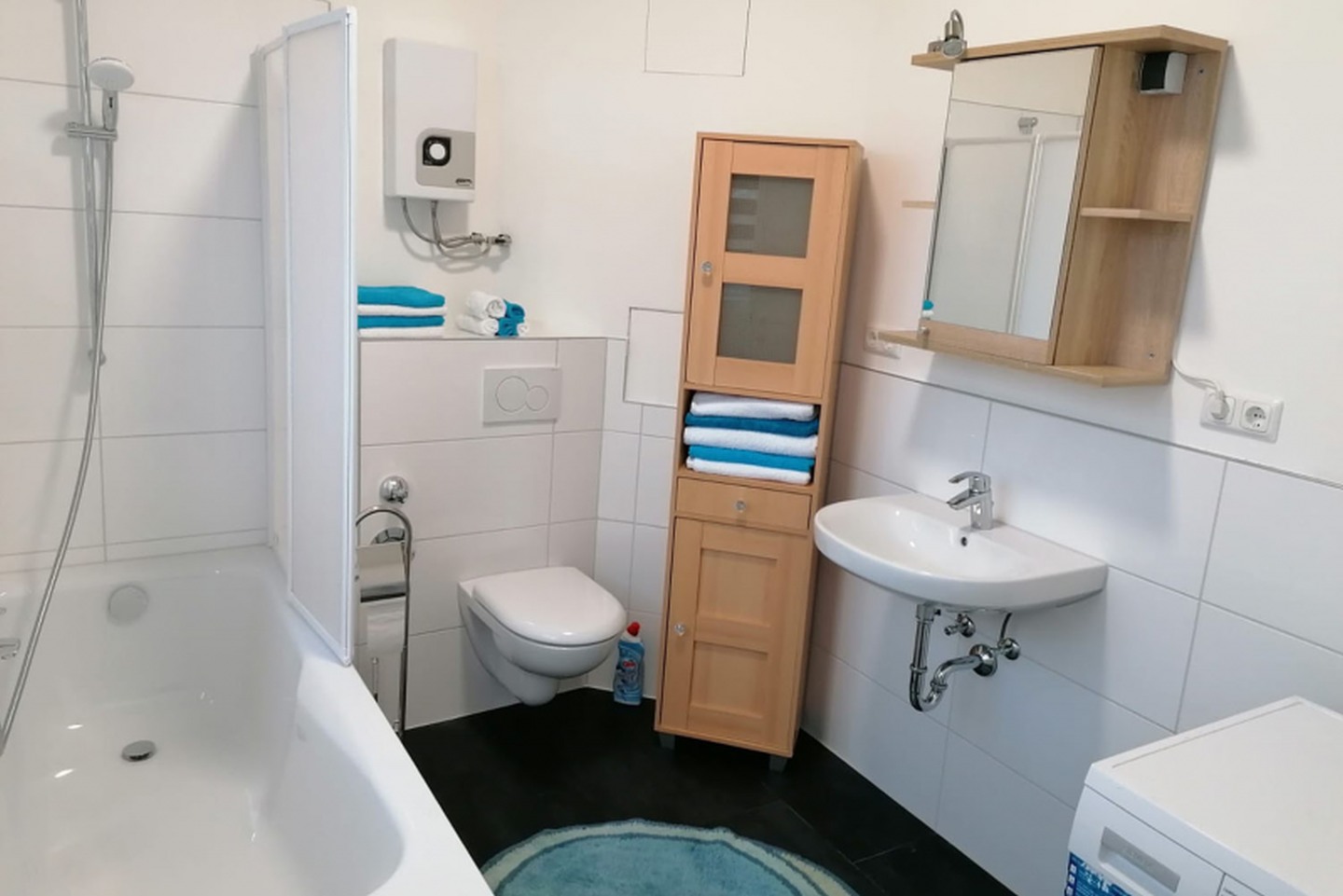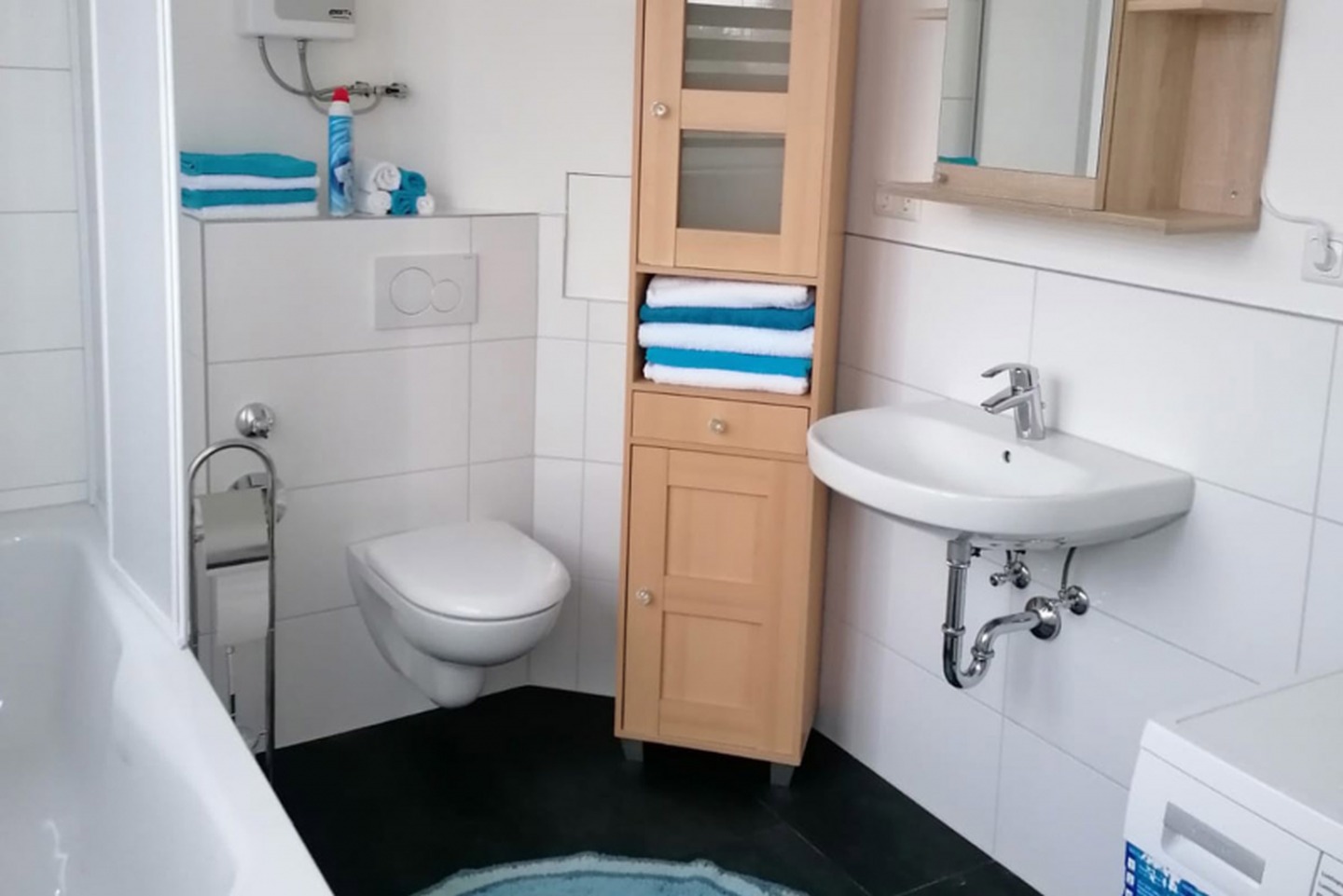 Bad und Sanitär: Duschbadewanne, WC, Handtücher