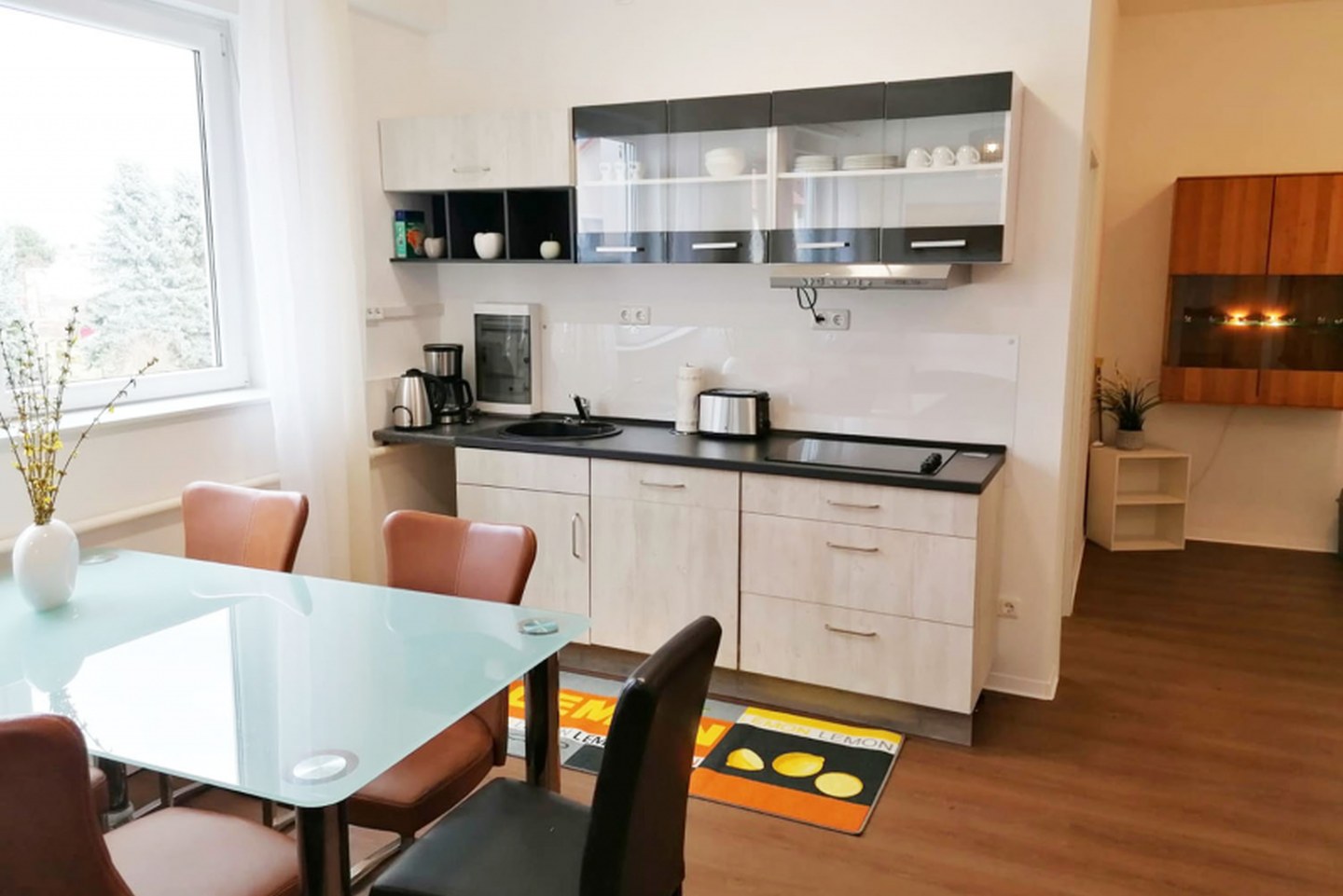 Küche und Haushaltsgegenstände: 4-Zonen Ceranfeld, Kühlschrank, Mikrowelle, Kaffeemaschine, Wasserkocher, Toaster, Geschirr