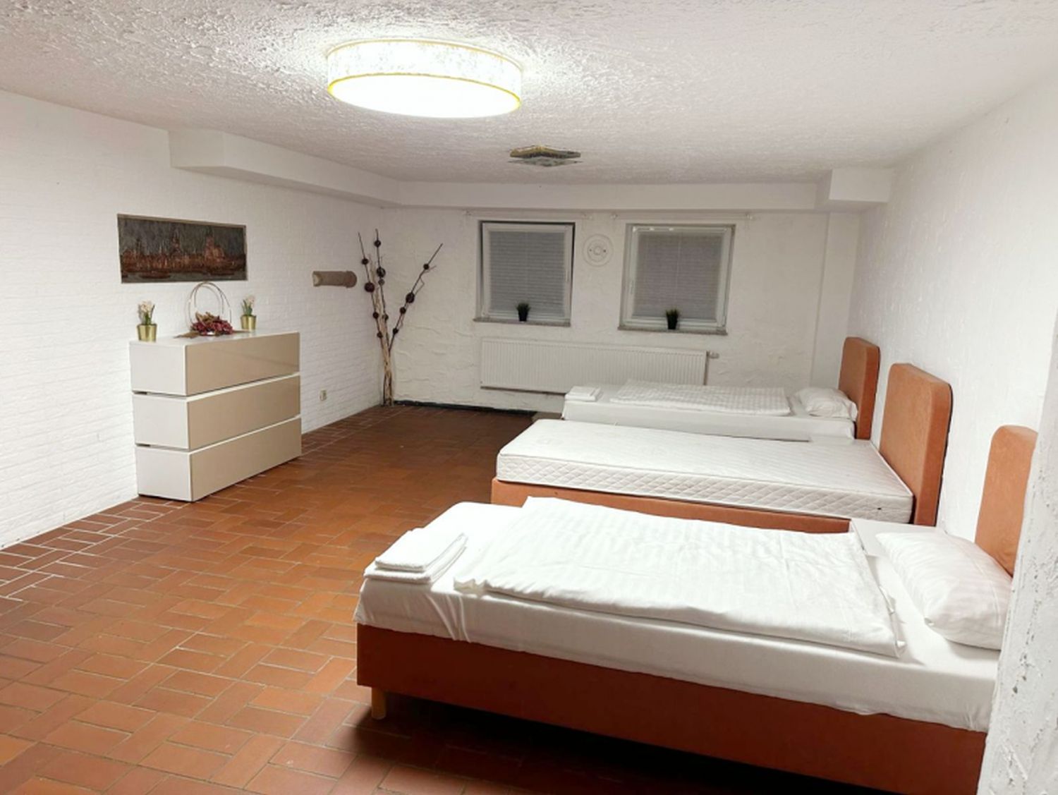 - Drei Schlafzimmer, jeweils mit 2 Einzelbetten, Kleiderschrank und Bettwäsche für Ihren Komfort. Hinweis: Von insgesamt 5 Zimmern ist 1 Raum dauerhaft verschlossen ist und darf nicht betreten werden. Es stehen somit 4 Zimmer zur Verfügung: 3 Schlafzimmer und 1 Wohnzimmer.