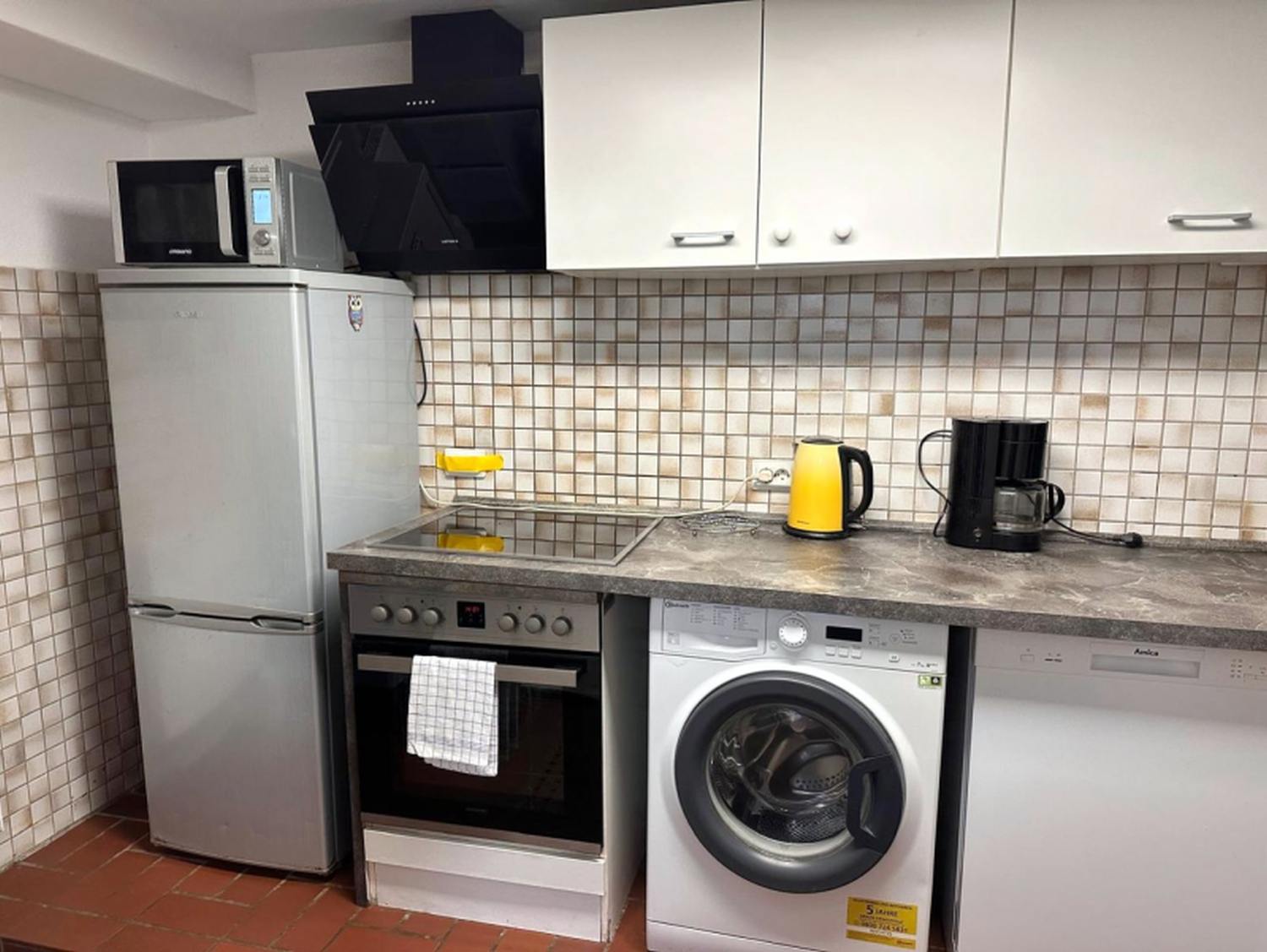 - Eine voll ausgestattete Küche mit einem 4-Zonen-Kochfeld, Backofen, Einbauküche, Gefrierschrank, Kaffeemaschine, Kühlschrank, Staubsauger, Toaster und Wasserkocher.