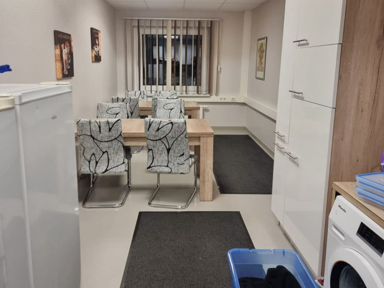 Gemeinschaftsküche (im Erdgeschoss): Kaffeemaschine, Geschirr, Tiefkühler, Wasserkocher, Mikrowelle, Backofen, Herd 4-Zonen, Waschmaschine, Trockner