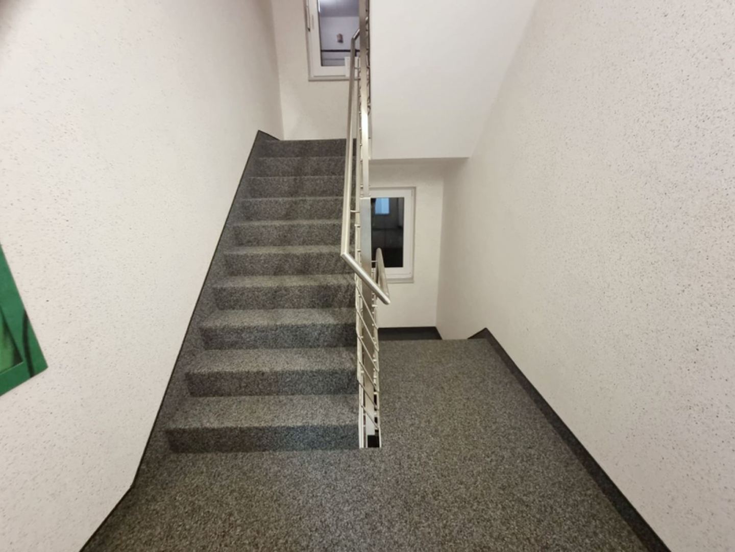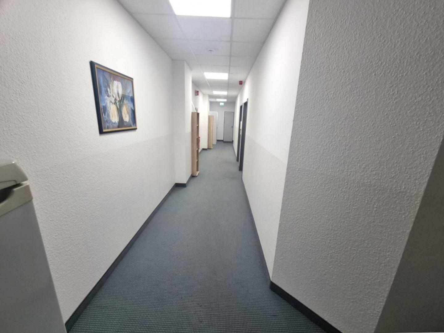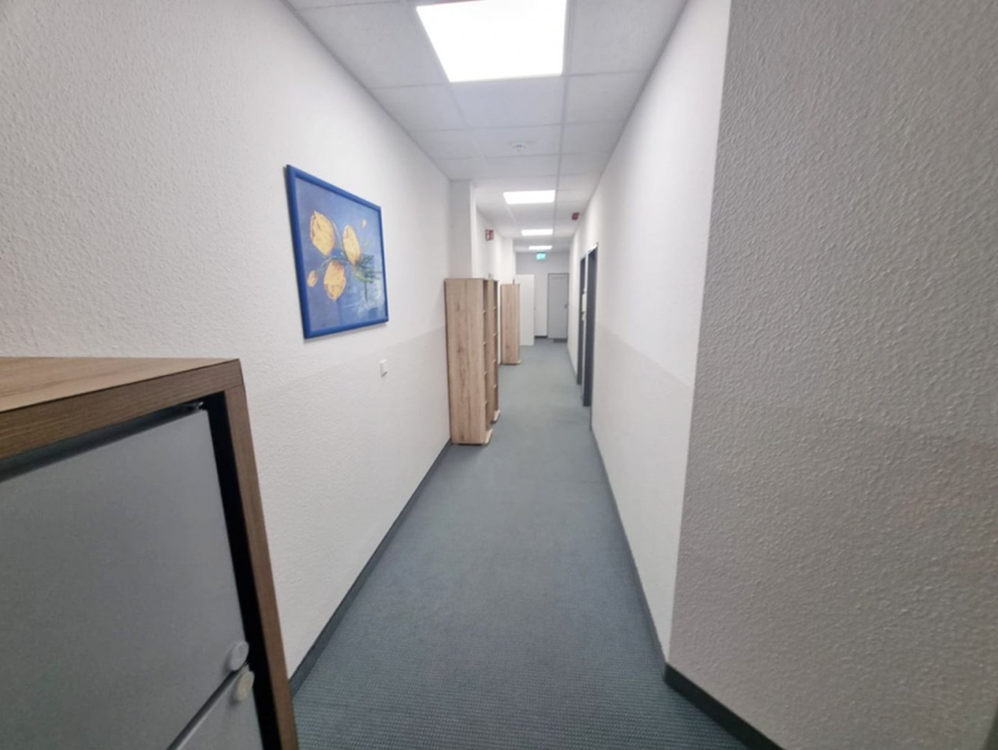 Gemeinsame Flur auf der Etage: Kühlschrank und Bücherregal