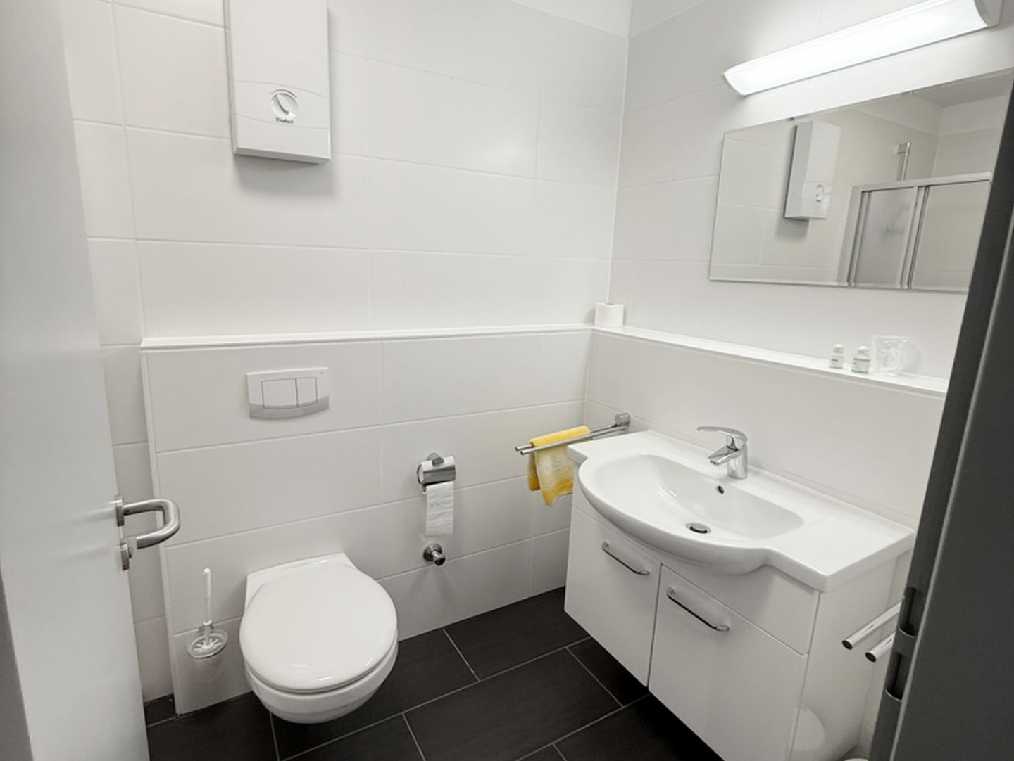 Badezimmer: Dusche, WC, Waschbecken, Handtücher, Föhn