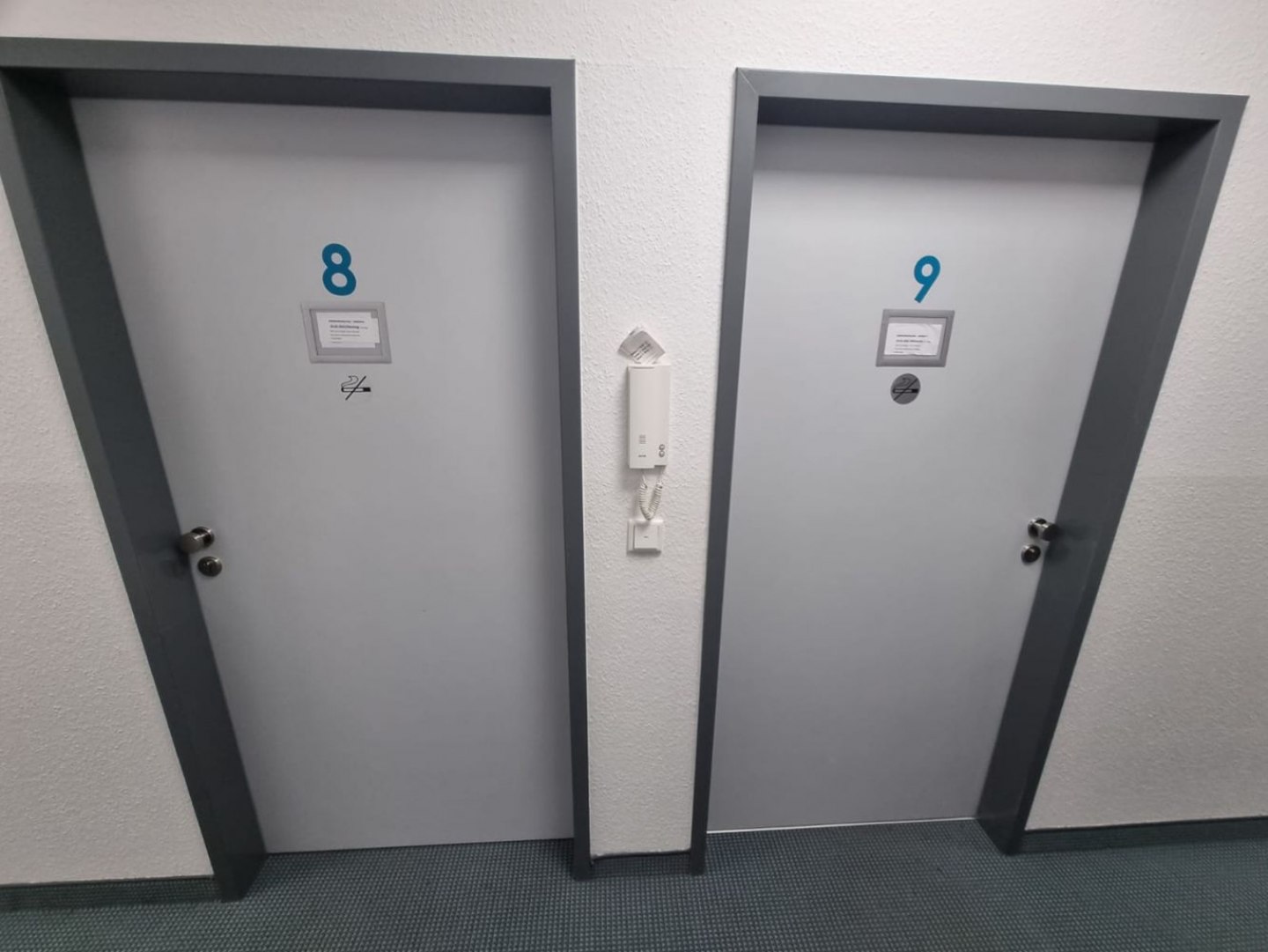 Darüber hinaus besitzt jedes Zimmer ein eigenes Badezimmer mit Dusche, WC, Waschbecken und Haartrockner. Auf jeder Etage befindet sich im Flur ein gemeinschaftlich nutzbarer Kühlschrank sowie ein Bücherregal.