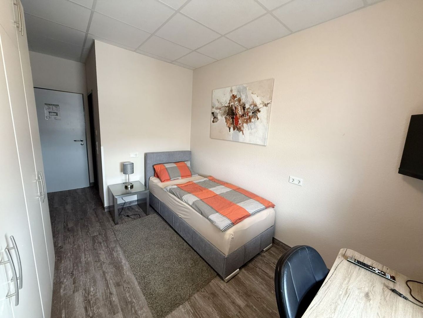 1 Einzelbett, Bettwäsche, Kleiderschrank, Smart-TV, Schreibtisch, Lüftungsanlage