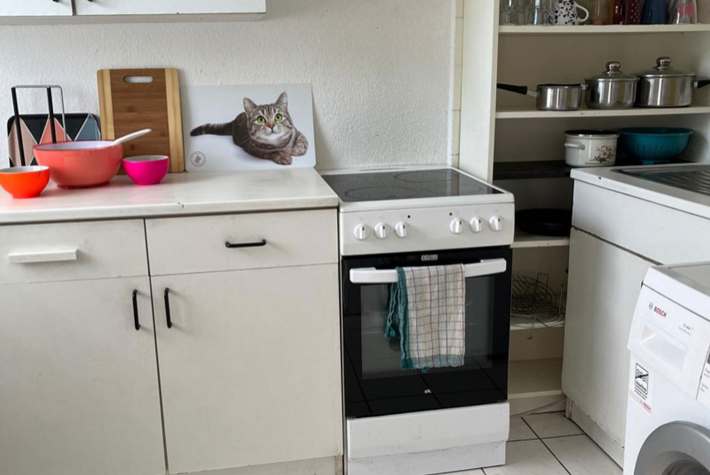 Küche und Haushaltsgegenstände: Küche, Essecke, Kaffeemaschine, Geschirr, Tiefkühler, Wasserkocher, Mikrowelle, Backofen, Herd 4-Zonen, Toaster