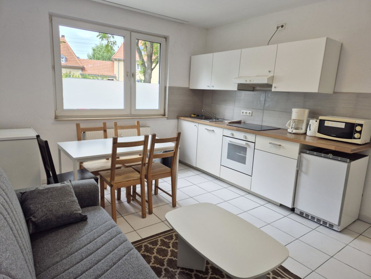 Kitchen/living room and household items: coffee machine, dishes, dishwasher, kettle, microwave, oven, refrigerator, stove. 4-zone