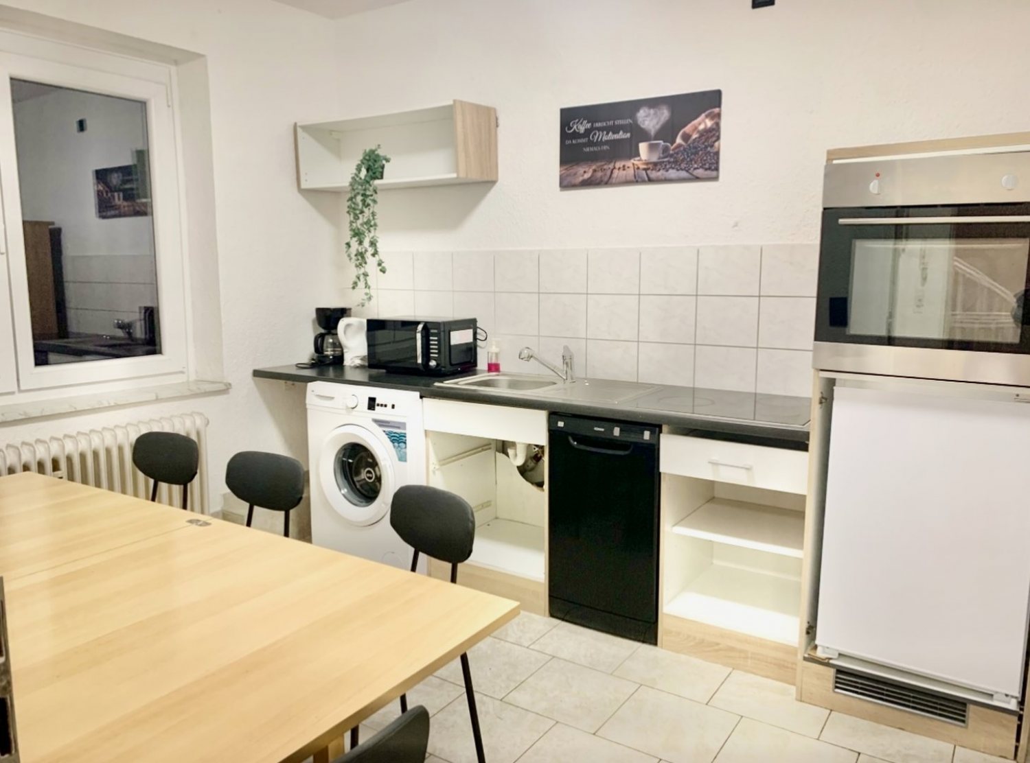 Küche und Haushaltsgegenstände: Küche, Essecke, Kaffeemaschine, Geschirr, Tiefkühler, Spülmaschine, Wasserkocher, Mikrowelle, Backofen,Kühlschrank, Herd 4 Zonen