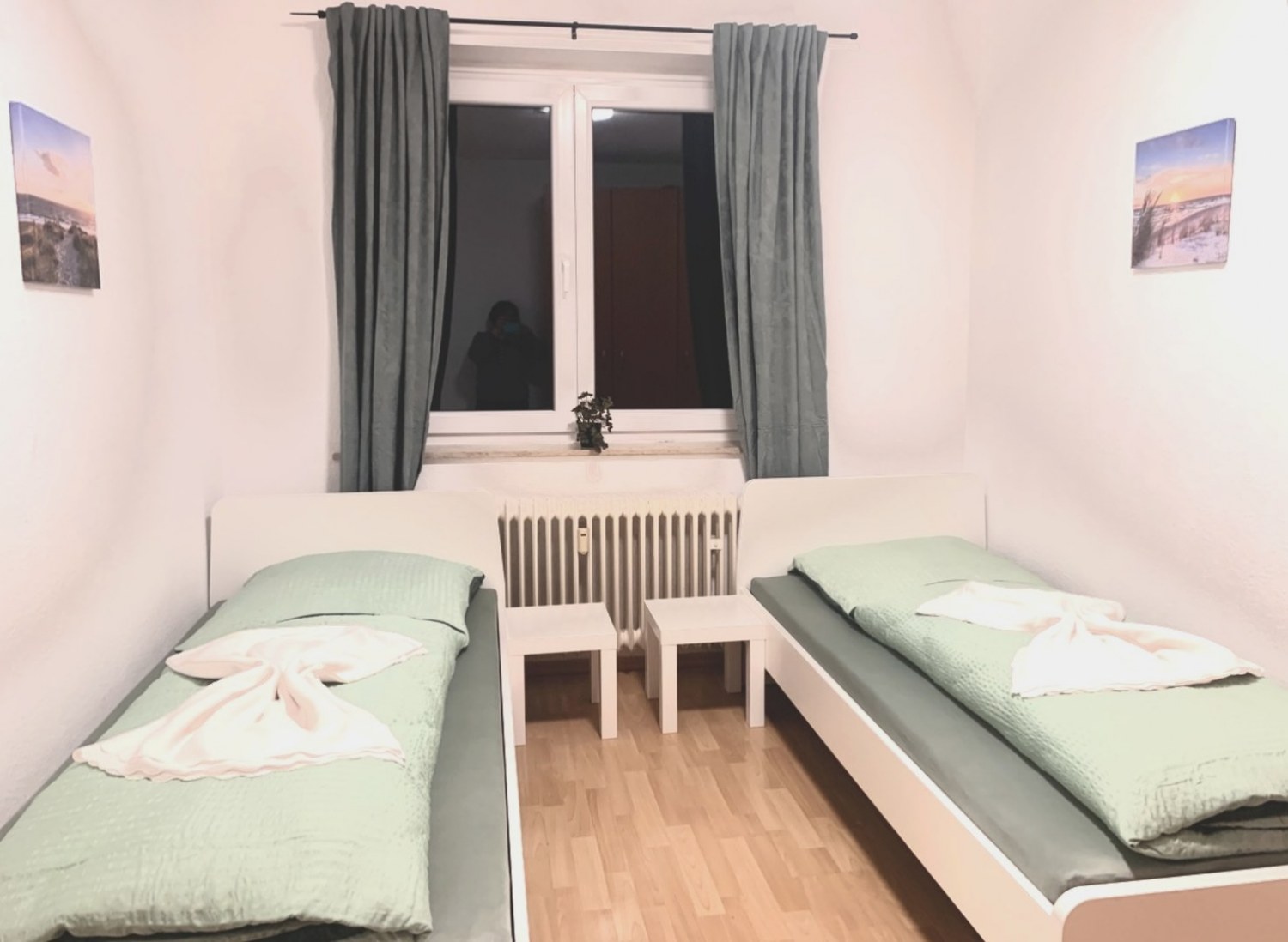 Wohn-Schlafzimmer : 3 Einzelbetten, Bettwäsche, Kleiderschrank