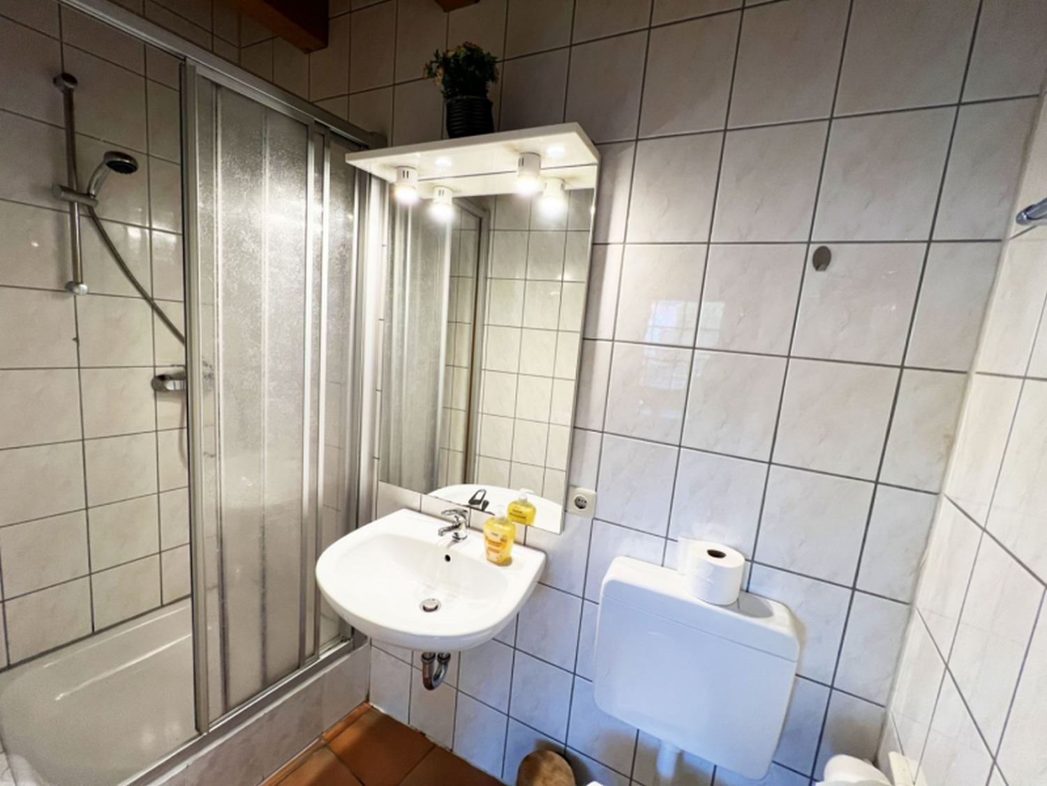 - Ein Badezimmer mit Dusche und WC für Ihre persönliche Pflege.