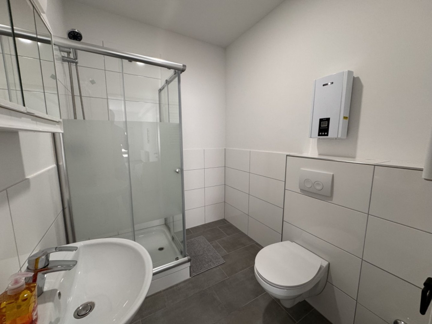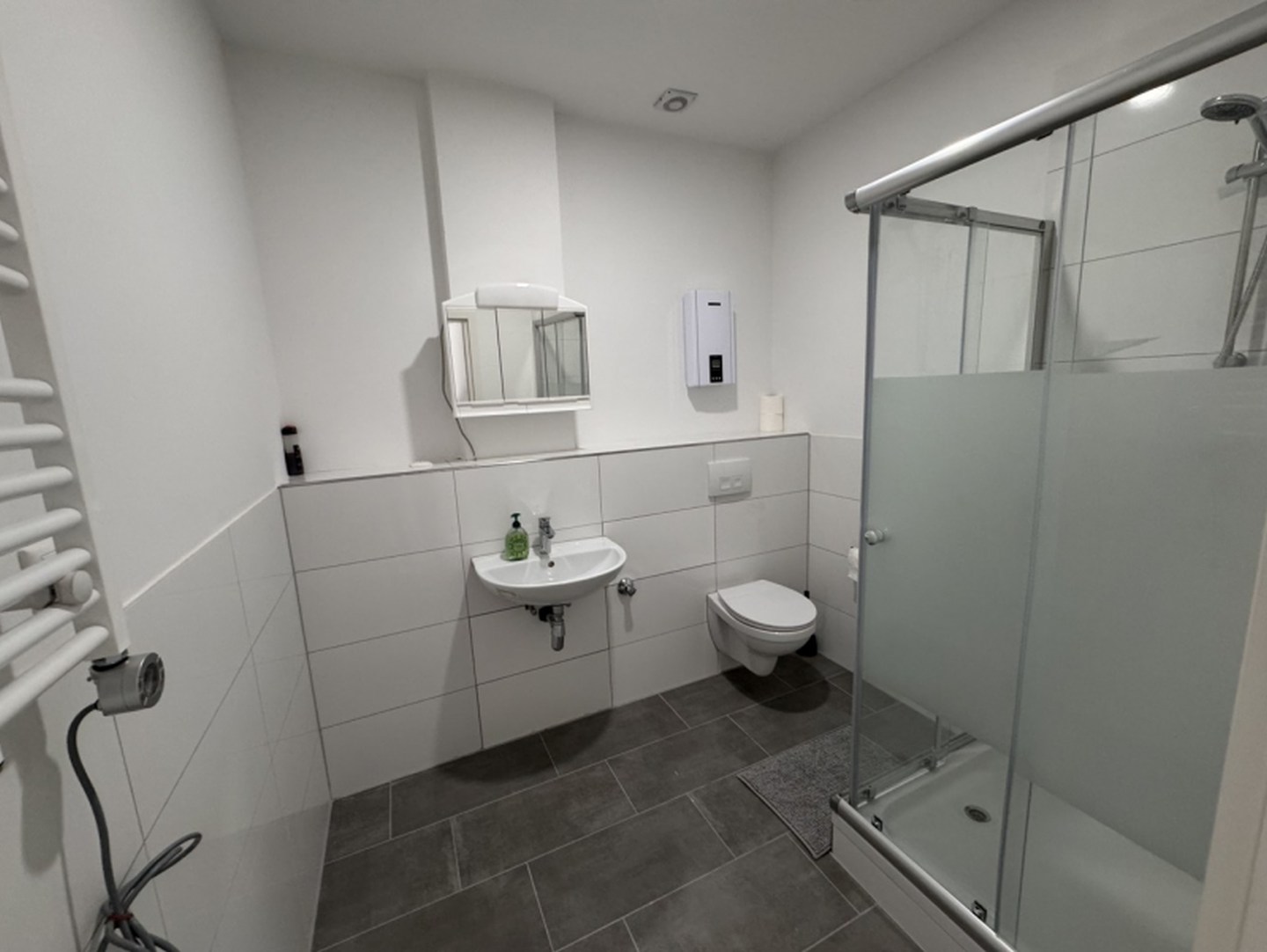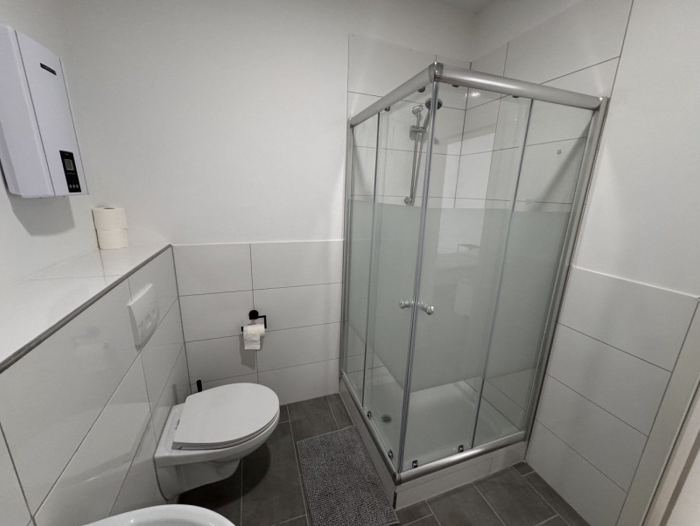 Bad und Sanitär: Badezimmer mit Dusche, WC, Waschbecken, Handtücher vorhanden