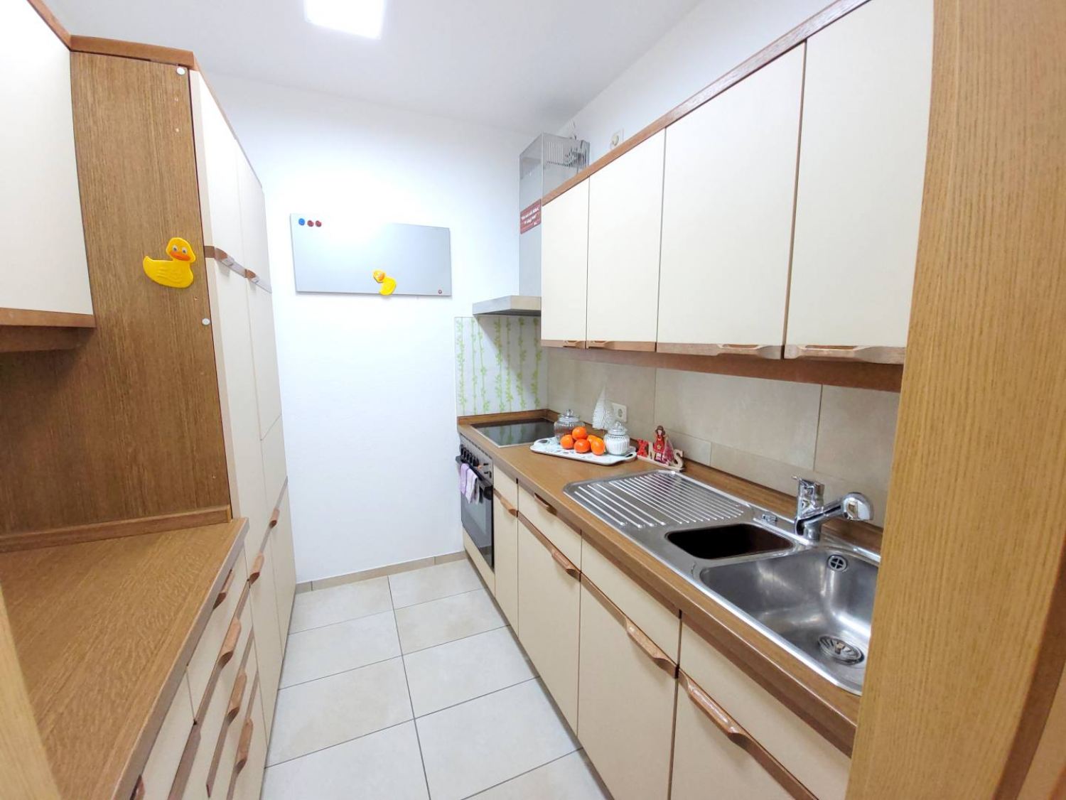 Küche (Raum), Essecke, Kaffeemaschine, Geschirr, Spülmaschine, Tiefkühler, Wasserkocher, Mikrowelle, Backofen, Kühlschrank, Herd 4-Zonen, Toaster