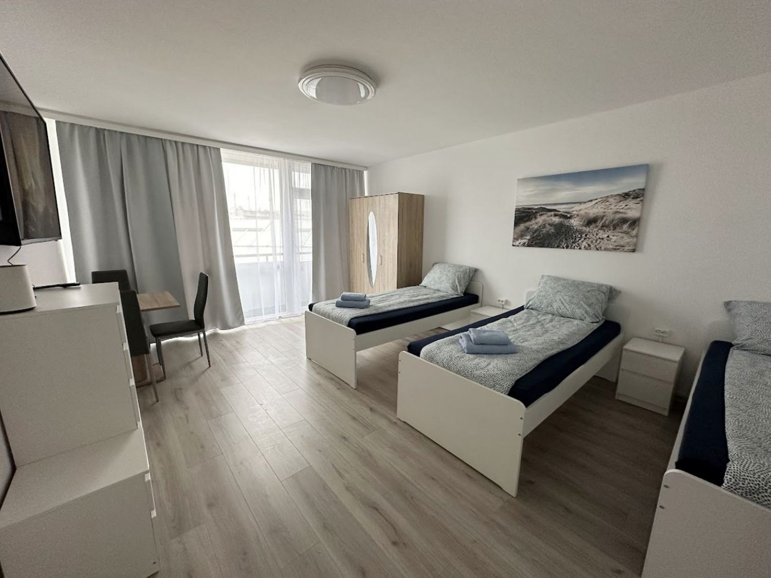 3 Einzelbetten, Bettwäsche, Kleiderschrank, Smart-TV