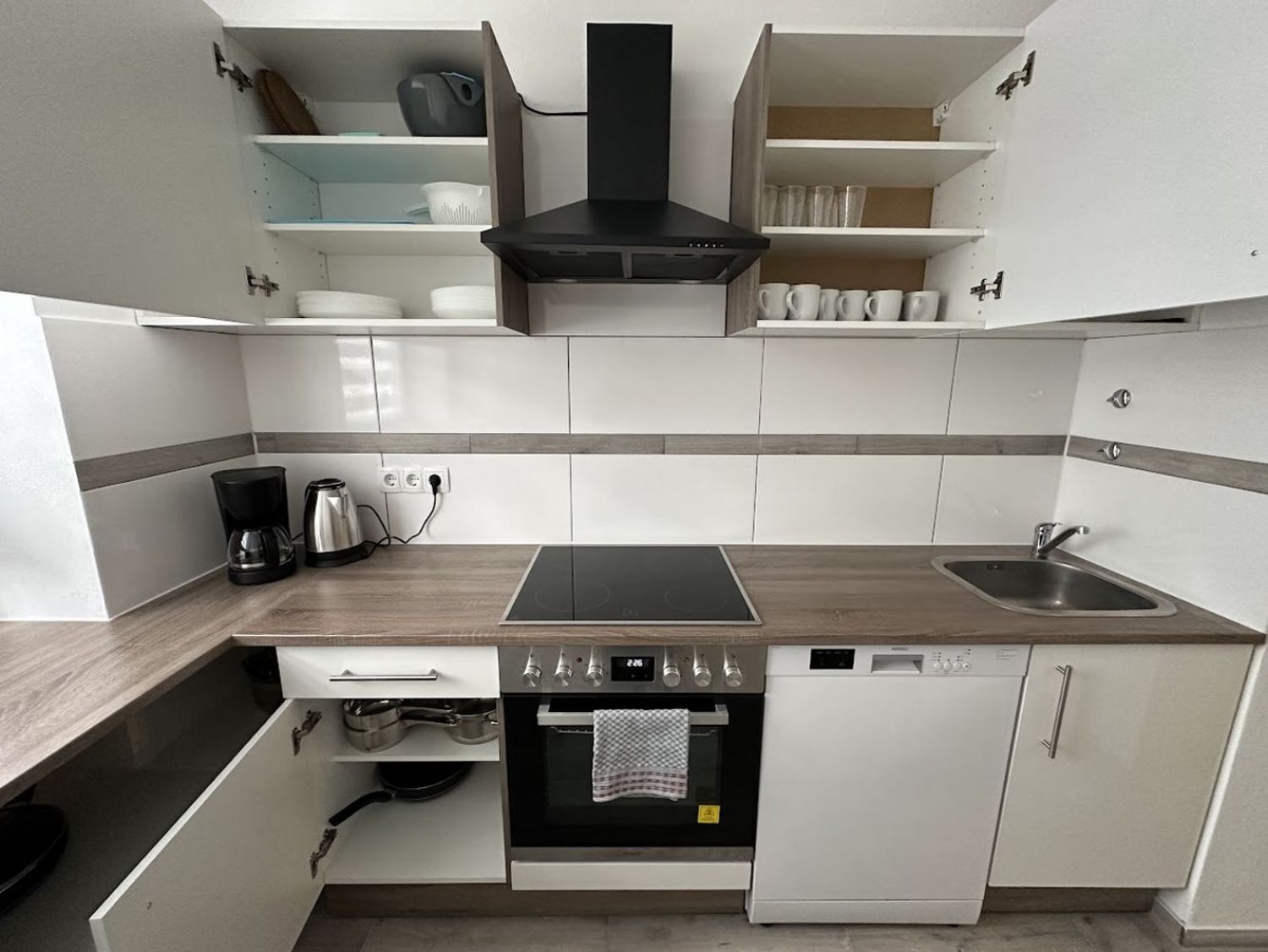 Küche (Raum), Essecke, Kaffeemaschine, Geschirr, Spülmaschine, Tiefkühler, Wasserkocher, Mikrowelle, Backofen, Kühlschrank, Herd 4-Zonen