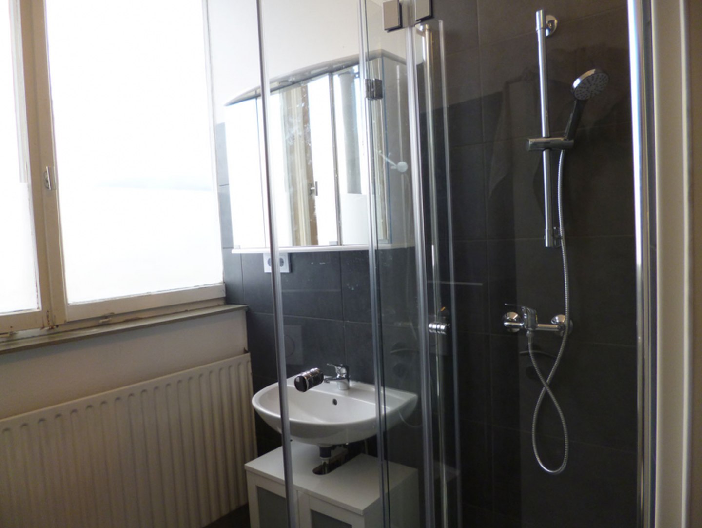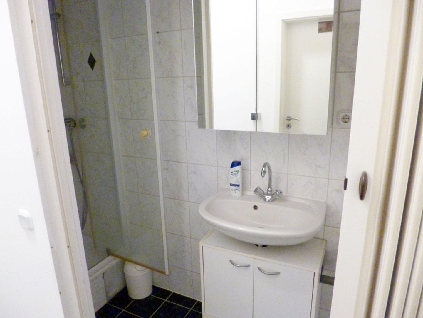 Bad 1: Dusche, Waschbecken mit Spiegel, Waschbeckenunterschrank