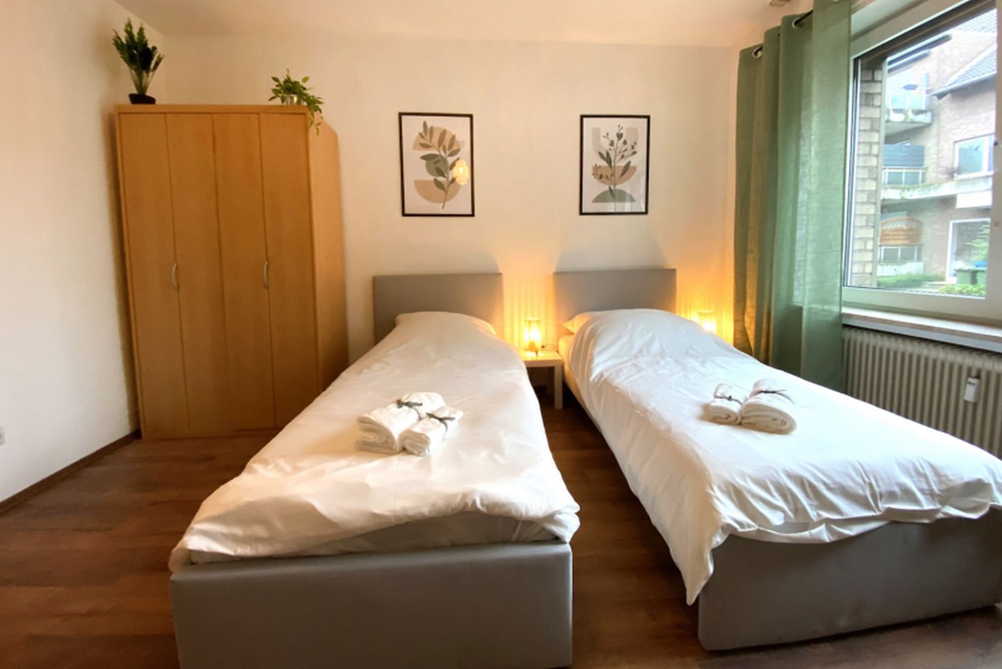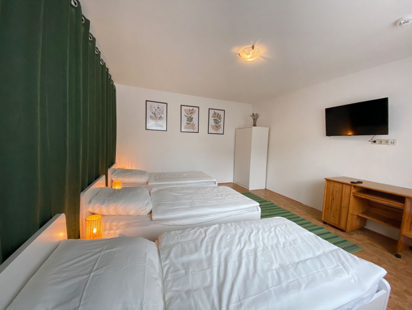 OH04: Das frisch möblierte 2-Zimmer-Apartment befindet sich im Erdgeschoss (links) und ist ca. 41 qm groß. Es bietet Platz für bis zu 3 Personen und verfügt über zwei separate Schlafzimmer mit jeweils 1 – 2 hochwertigen Einzelbetten. Die Schlafräume sind mit Verdunklungsjalousien und einem TV ausgestattet, um für eine gemütliche Schlaf-Atmosphäre zu sorgen. Eine vollständig ausgestattete Küche und ein Badezimmer stehen ebenfalls in der Wohnung zur Verfügung.