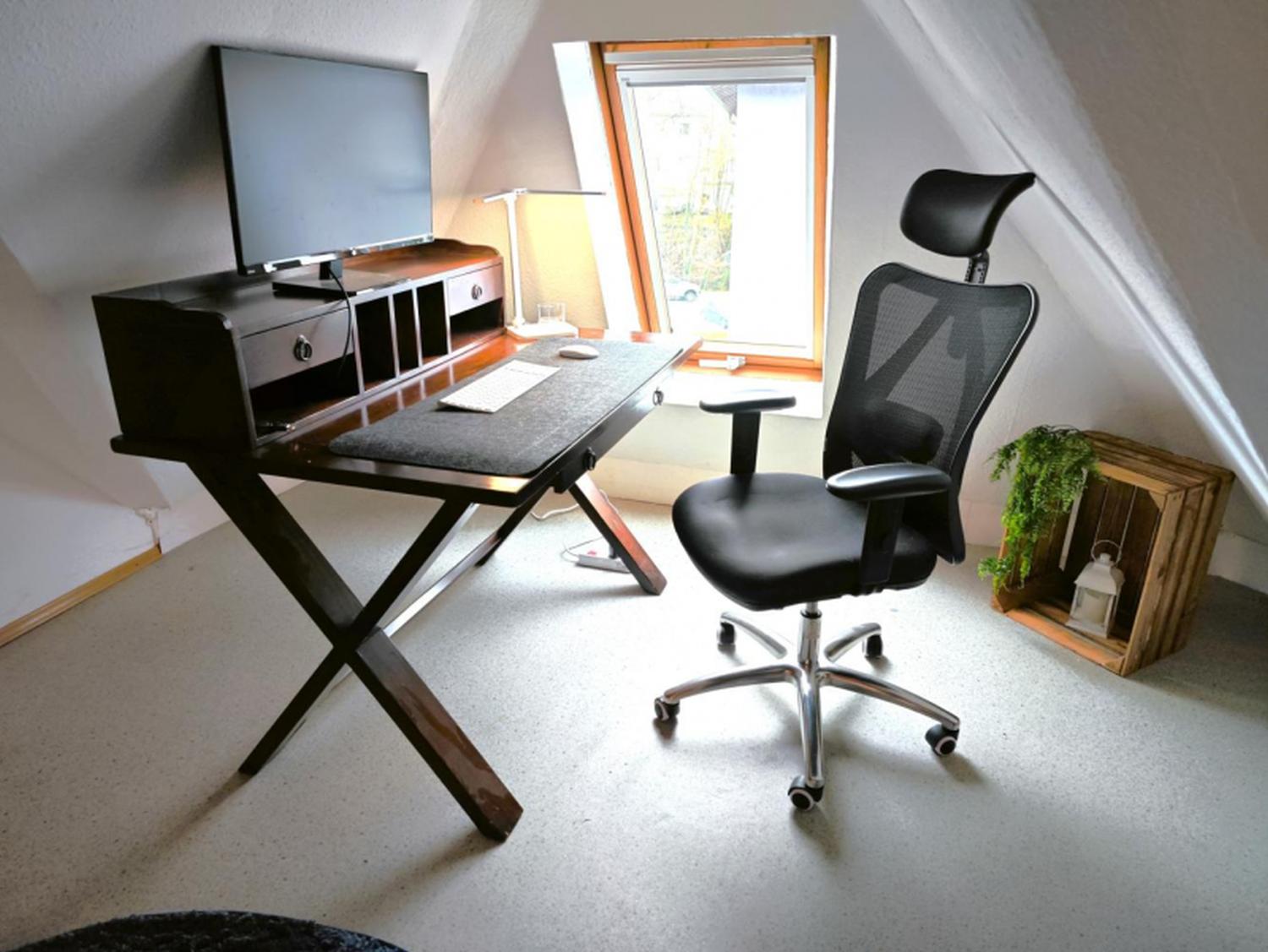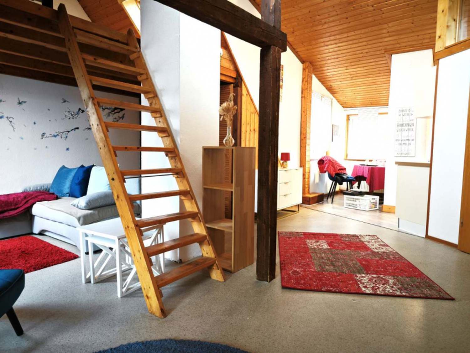 Die Einbau-Kleiderschränke bieten viel Stauraum. Der Schlafbereich auf der Empore, der über eine Leiter erreichbar ist, hat zwei 90 cm x 200 cm große Einzelbetten, welche auch als Doppelbett zusammengeschoben werden können (180 x 200 cm). Zusätzlich gibt es ein bequemes Schlafsofa (ca. 130 cm x 200 cm Liegefläche) mit Topper für eine dritte Person. Zudem kann ein Klappbett für eine vierte Person aufgebaut werden. Der Wohnbereich mit Schlafsofa und einem bequemen Sessel bietet Platz zum Entspannen. Der Arbeitsbereich verfügt über einen Schreibtisch mit Bildschirm, Tastatur, Maus und Schreibtischstuhl für produktive Stunden im Homeoffice. Das Badezimmer ist renoviert und modern gestaltet.