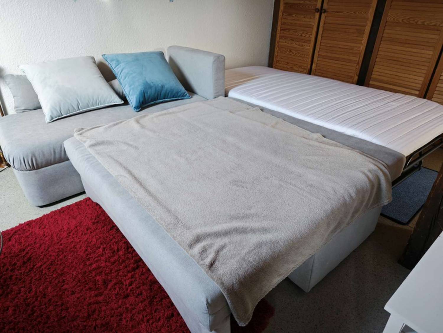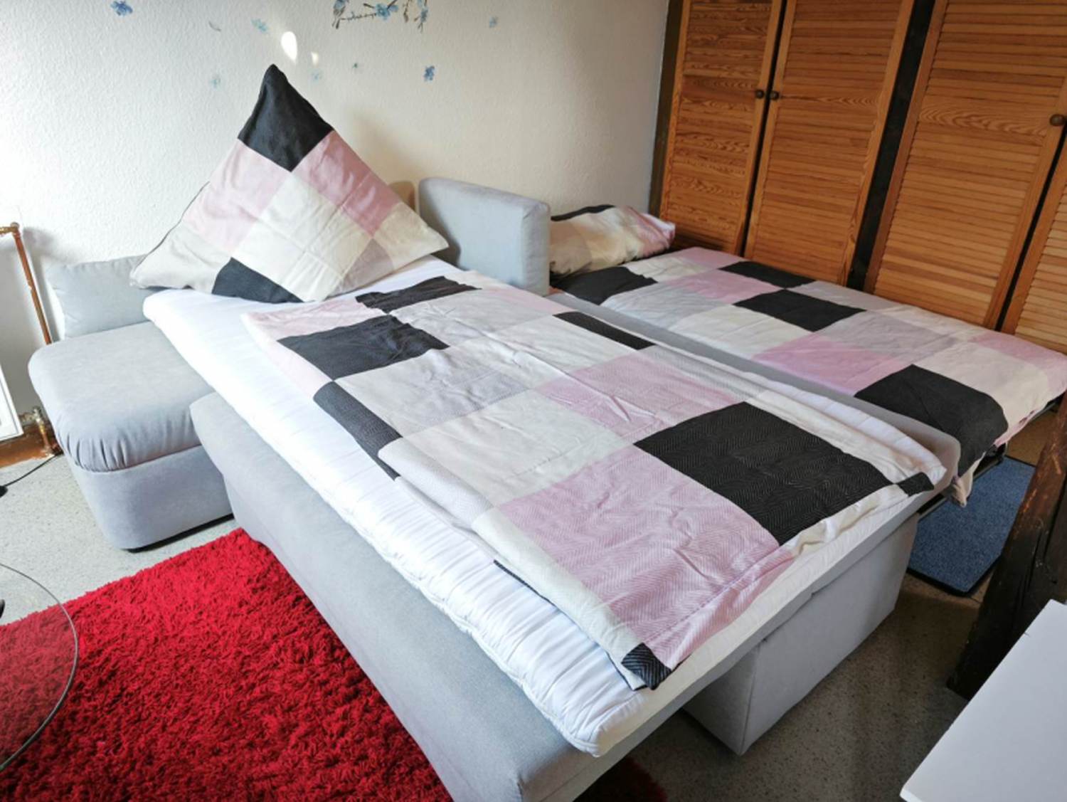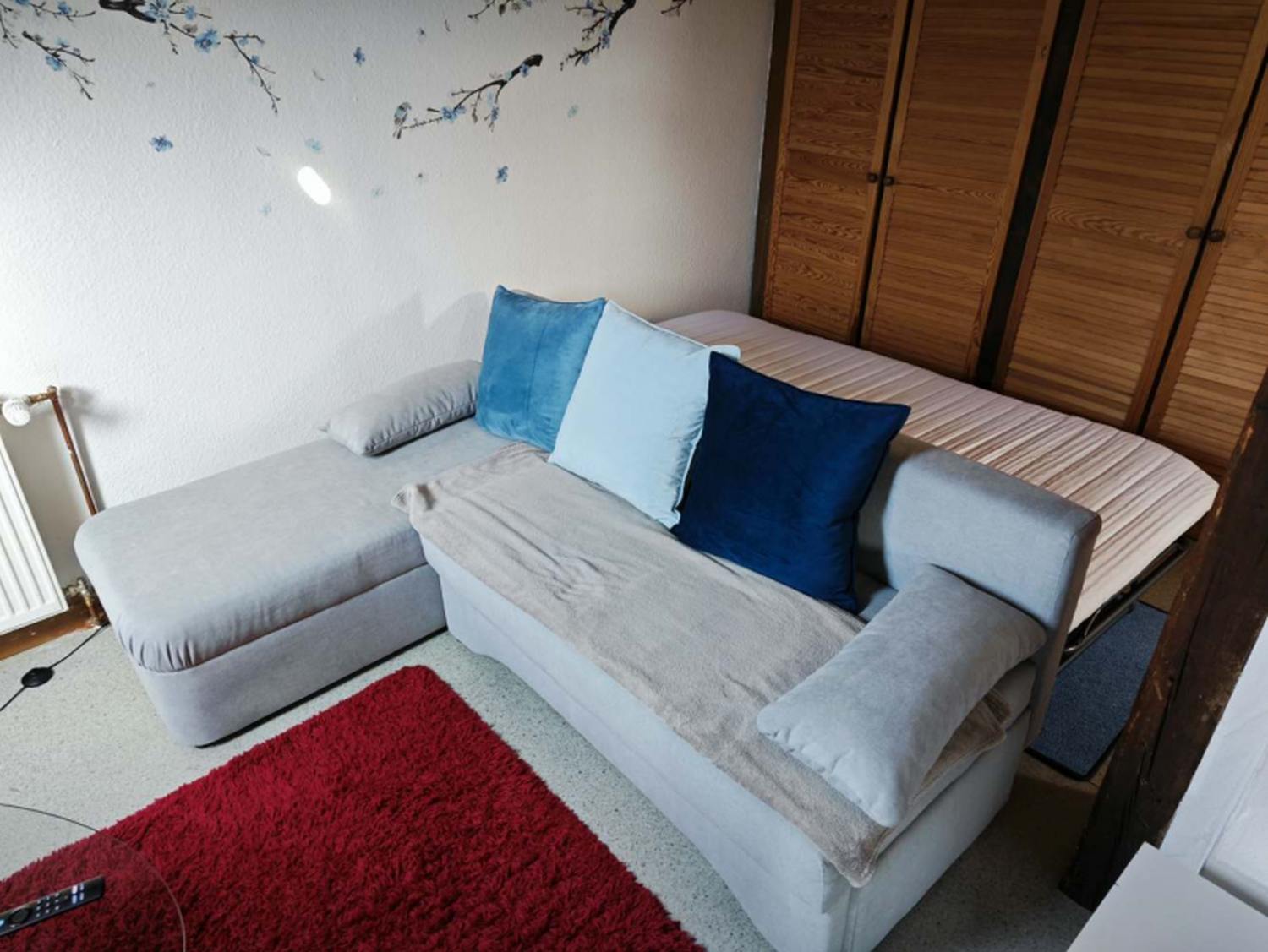 Wohn-/Schlafzimmer: 1 Einzelbett, 1 Schlafsofa, Bettwäsche, Kleiderschrank