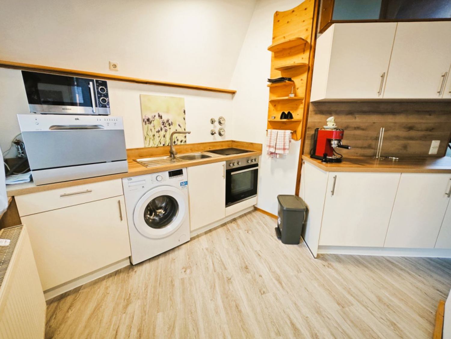 Küche: Essecke, Kaffeemaschine, Geschirr, Spülmaschine, Tiefkühler, Wasserkocher, Mikrowelle, Backofen, Kühlschrank, Gewürze, 4-Zonen-Herd, Toaster