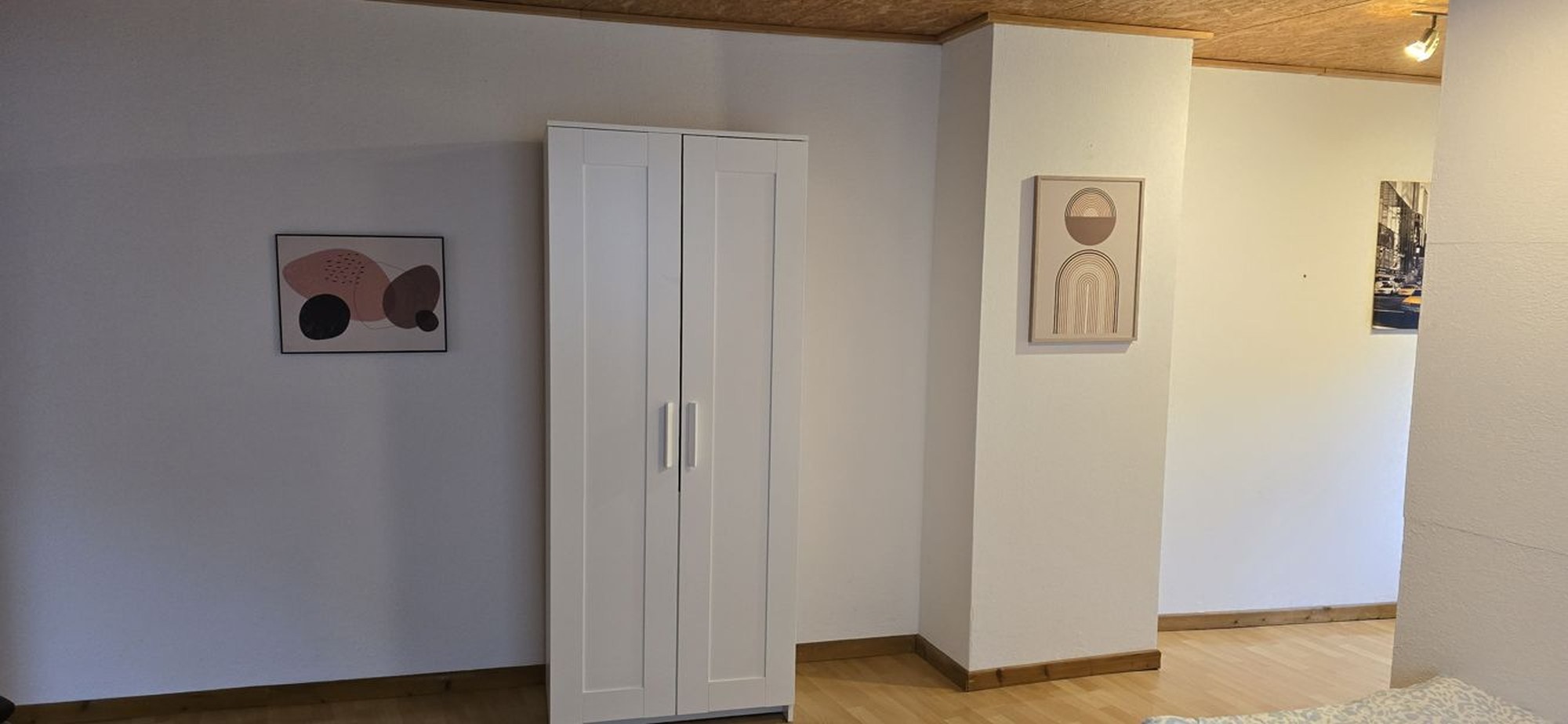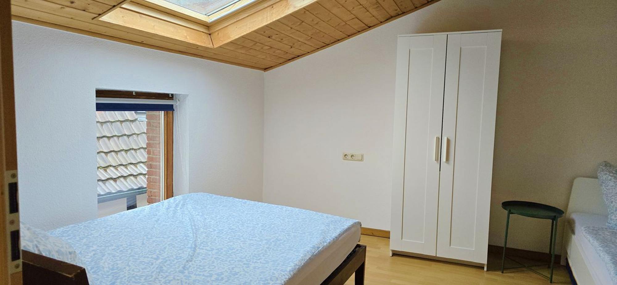 Im Obergeschoss (erreichbar über eine Stahl-Wendeltreppe) erreicht man zunächst einen Flur über den man die beiden getrennten Räume erreicht. In einem dieser Räume ist eine offene Trennwand vorhanden, sodass der Raum optisch in 2 Bereiche aufgeteilt wird.