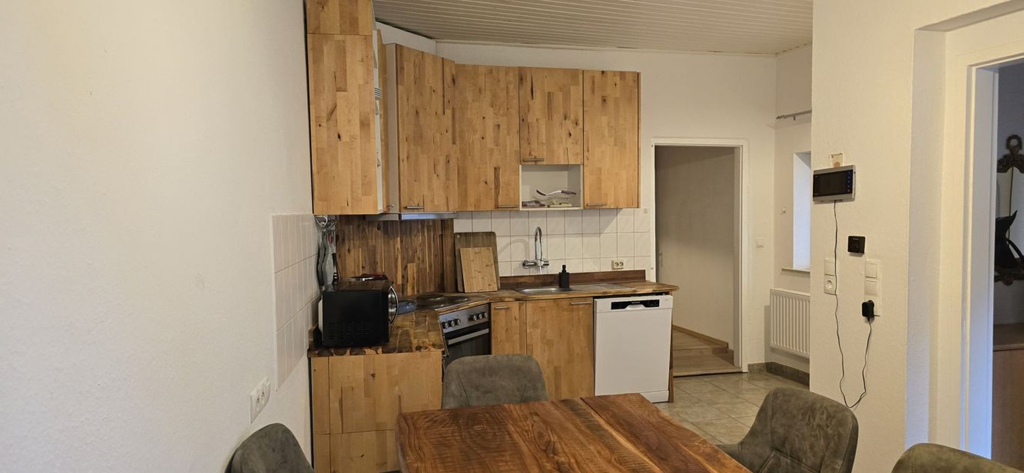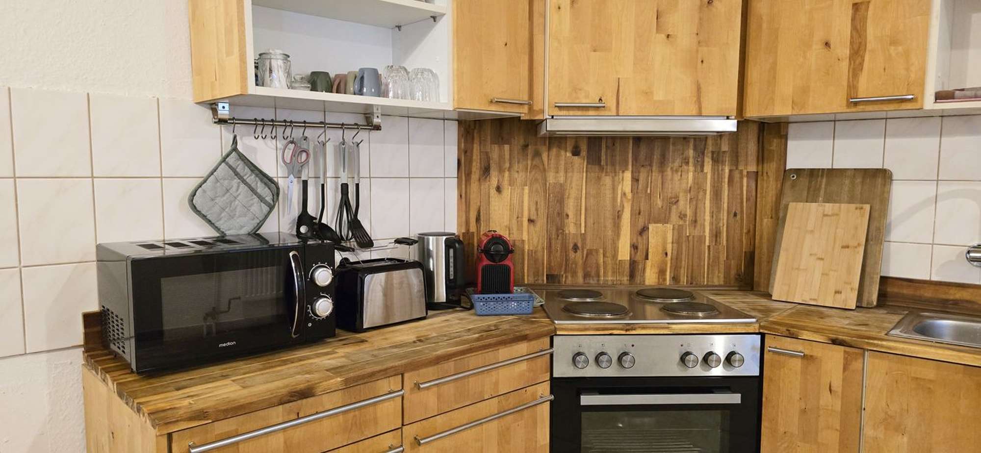 Küche (Raum), Essecke, Kaffeemaschine, Geschirr, Wasserkocher, Mikrowelle, Backofen, Kühlschrank, Herd 4-Zonen, Toaster