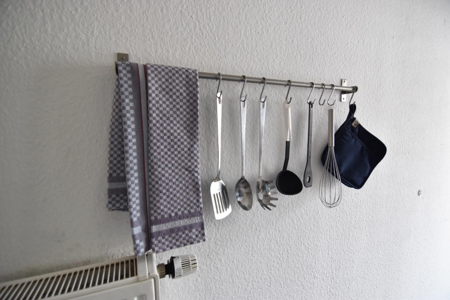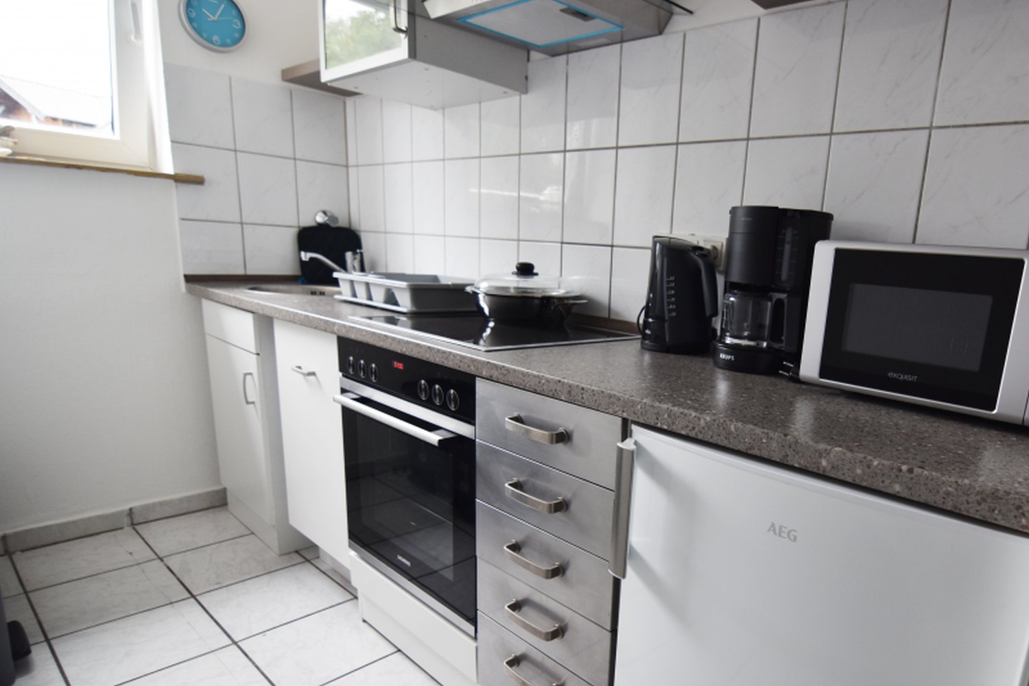 Küche und Haushaltsgegenstände: 4-Zonen-Kochfeld, Einbauküche, Spülmaschine, Kaffeemaschine, Kühlschrank, Mikrowelle, Staubsauger, Toaster, Wasserkocher