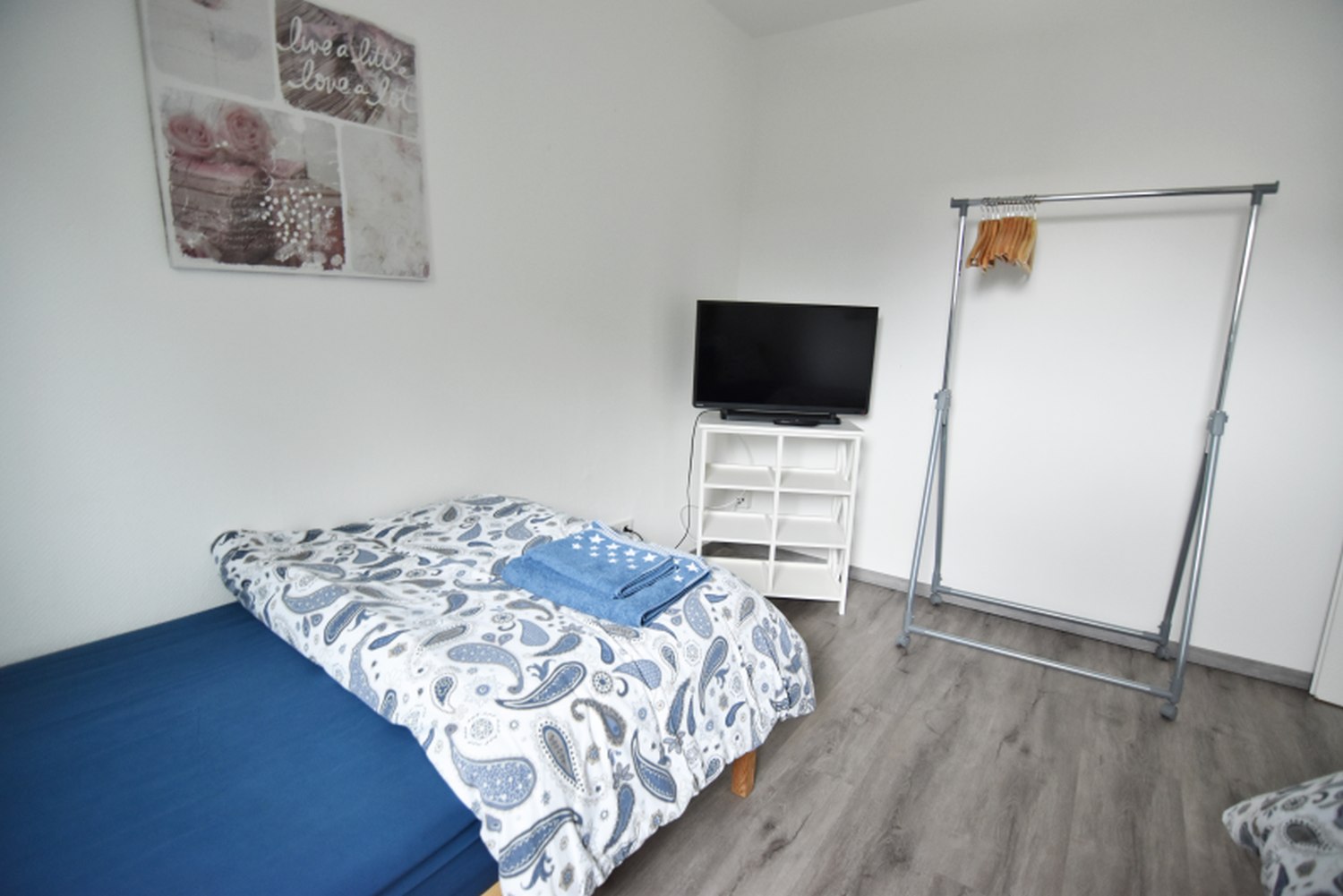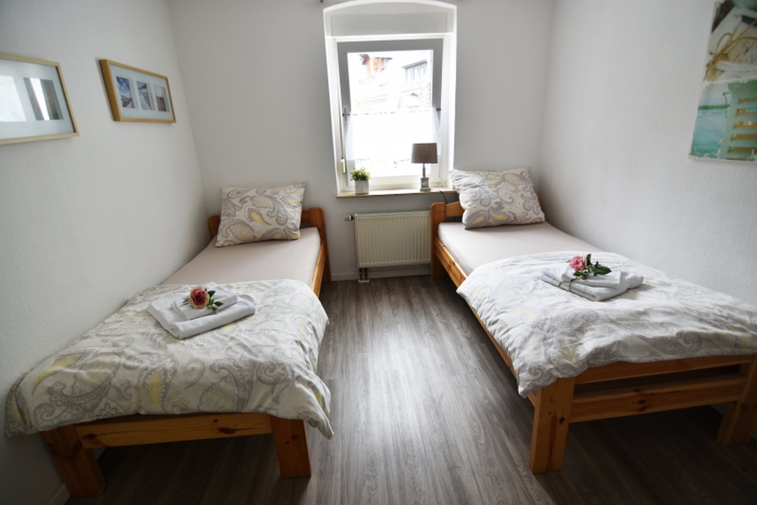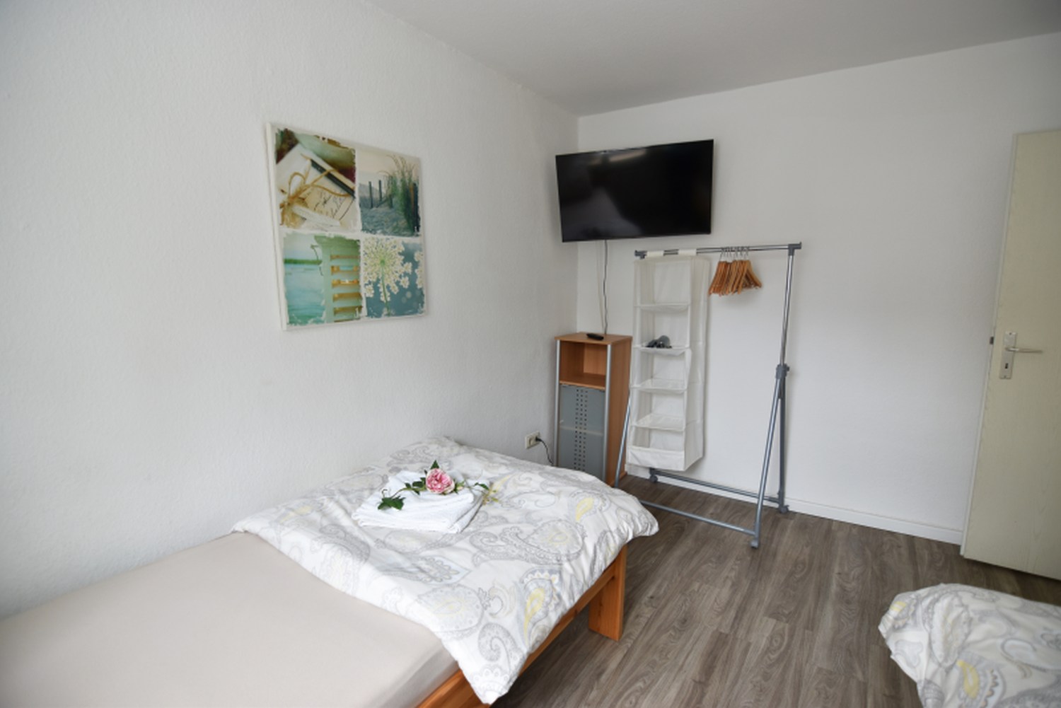 Schlafzimmer: 2 Einzelbetten, Kleiderstange, Bettwäsche, TV