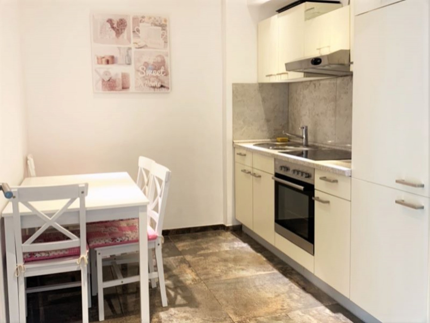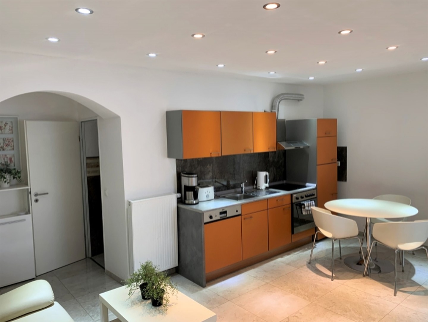 Küche und Haushaltsgegenstände: Küche, Essecke, Esszimmer, Kaffeemaschine, Geschirr, Tiefkühler, Wasserkocher, Mikrowelle, Backofen, Kühlschrank, Herd 4-Zonen