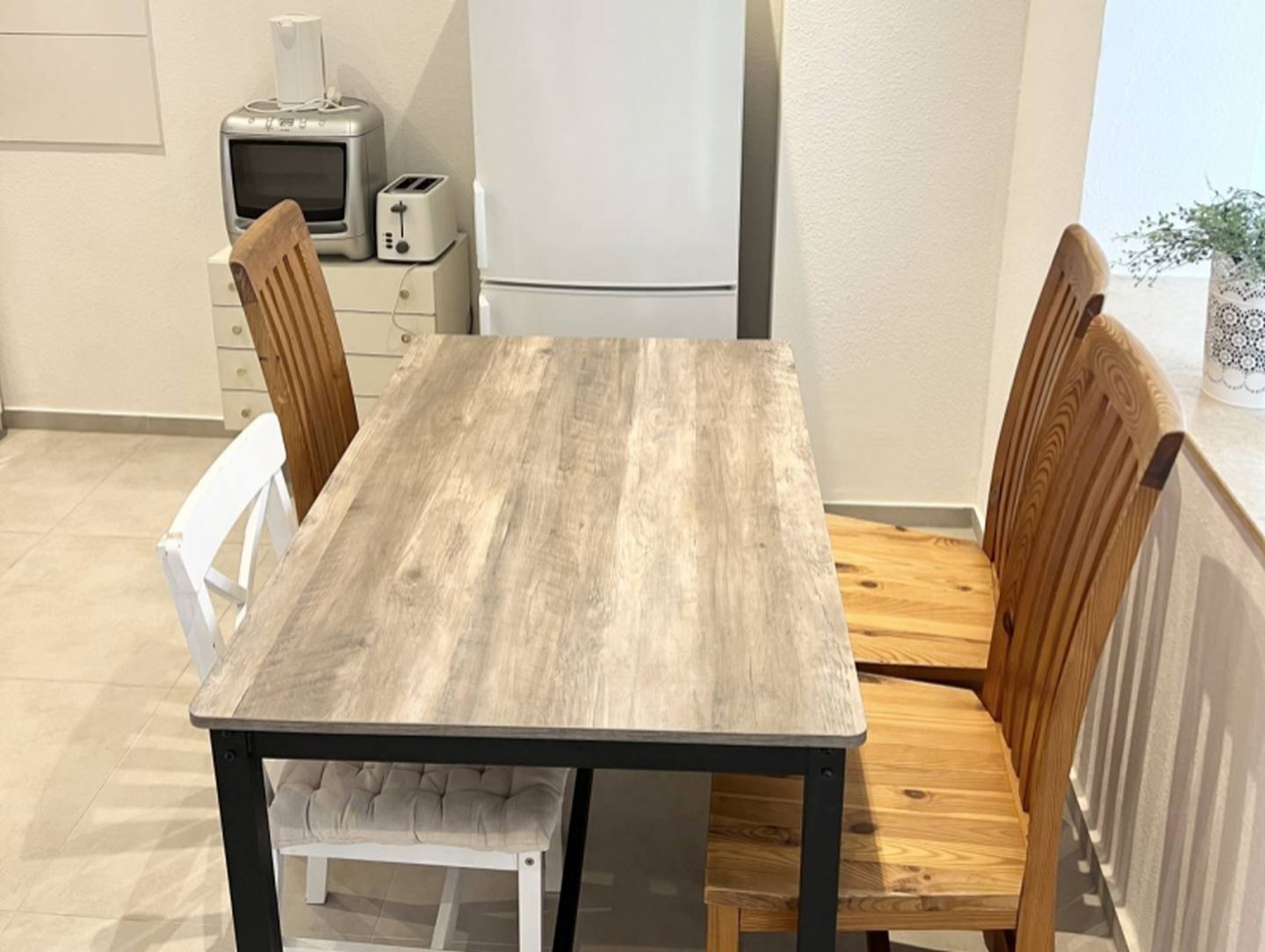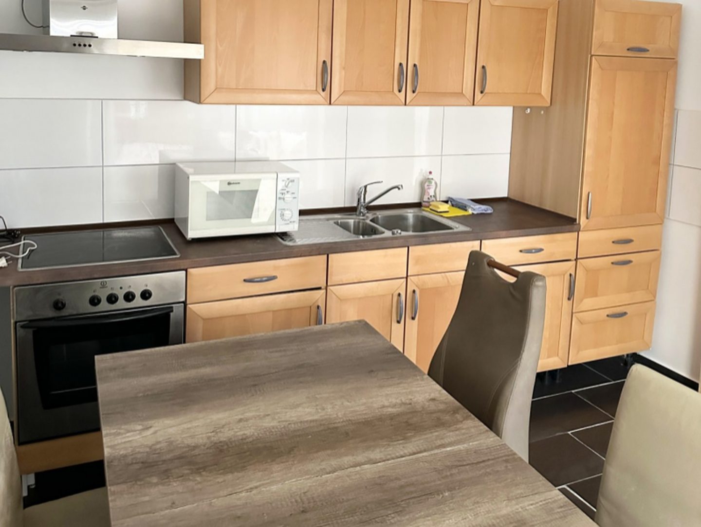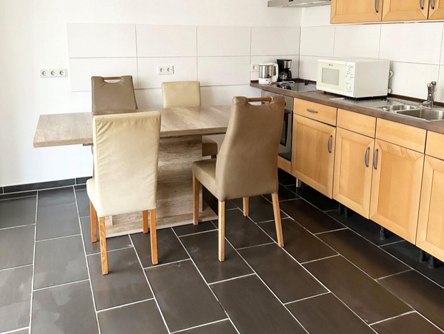 Küche und Haushaltsgegenstände: Küche, Essecke, Esszimmer, Kaffeemaschine, Geschirr, Tiefkühler, Wasserkocher, Mikrowelle, Backofen, Kühlschrank, Herd 4-Zonen