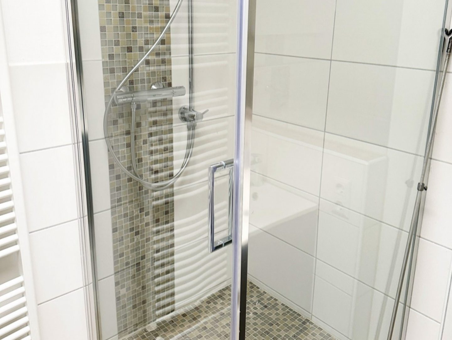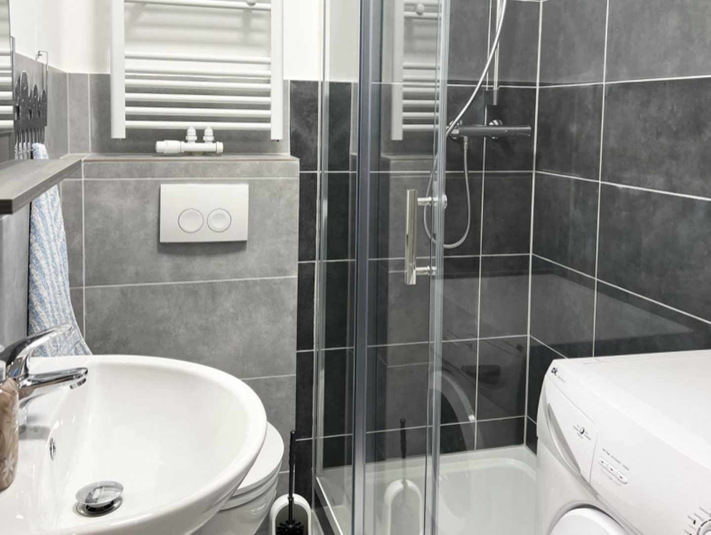Bad und Sanitär: Dusche, Handtücher, WC, Waschbecken.