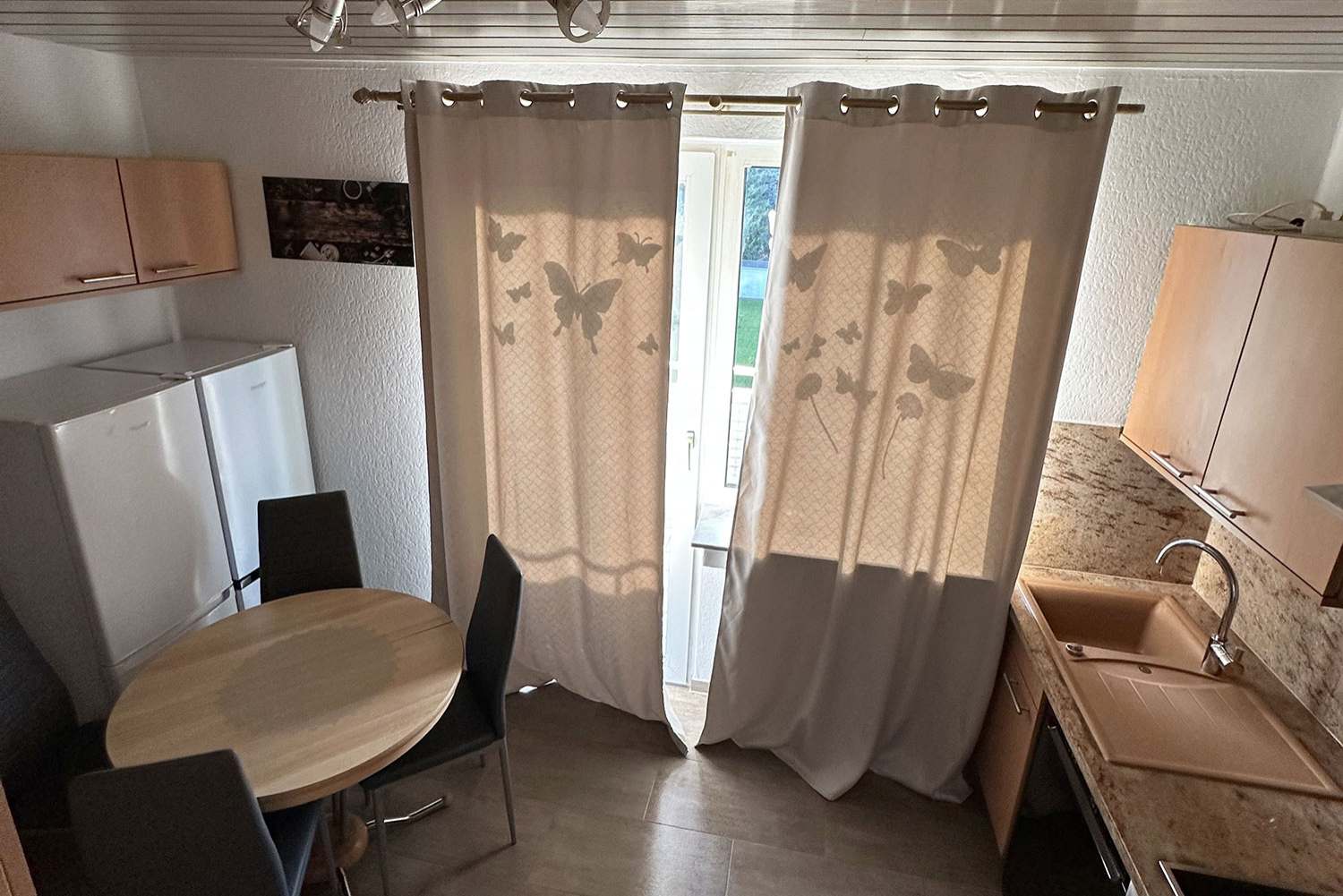Küche und Haushaltsgegenstände: Küche separat, Essecke, Kaffeemaschine, Geschirr, Spülmaschine, Tiefkühler, Wasserkocher, Mikrowelle, Backofen, Herd 4-Zonen