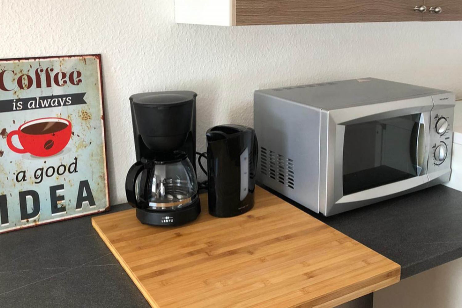 Küche und Haushaltsgegenstände: 4-Zonen-Kochfeld mit Backofen, Kühlschrank, Kaffeemaschine, Mikrowelle, Wasserkocher