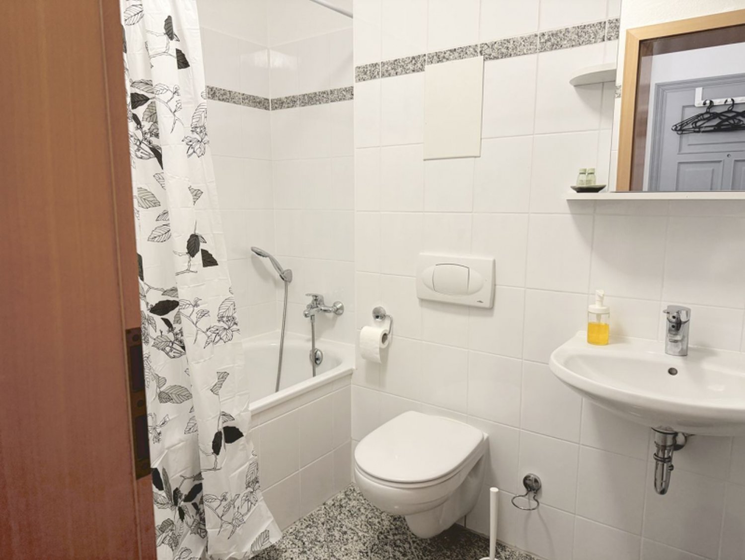 Bad und Sanitär: Duschwanne, WC, Waschbecken, Handtücher